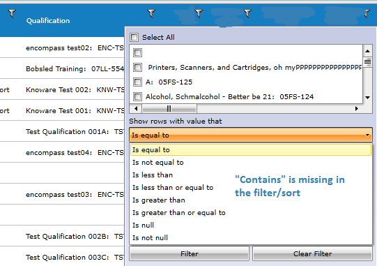 I am using the RadGrid in silverlight .Net, in this grid column was a combobx and the DateMemberBinding is Interger(Primary Key) and the DisplayColumnName="Qualification", ValueColumnName="QualificationNo_PK" when I tried to filter, the "contains" filter options are not showing for this column.