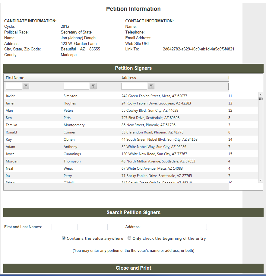 <%@ Page Title="" Language="C#" MasterPageFile="~/Masters/EPSDev3.master" AutoEventWireup="true" CodeFile="PetitionInfo.aspx.cs" Inherits="PetitionInfo" %><asp:Content ID="Content1" ContentPlaceHolderID="head" Runat="Server"><style type="text/css"> .VerticalAlign1 { padding-top: 6px; }</style> </asp:Content><asp:Content ID="Content2" ContentPlaceHolderID="ContentPlaceHolder1" Runat="Server"> <telerik:RadScriptManager ID="RadScriptManager1" runat="server" /> <!-- content start --> <telerik:RadAjaxManager ID="RadAjaxManager1" runat="server"> <AjaxSettings> <telerik:AjaxSetting AjaxControlID="SignersGrid"> <UpdatedControls> <telerik:AjaxUpdatedControl ControlID="SignersGrid" LoadingPanelID="RadAjaxLoadingPanel1" /> </UpdatedControls> </telerik:AjaxSetting> </AjaxSettings> </telerik:RadAjaxManager> <telerik:RadAjaxLoadingPanel ID="RadAjaxLoadingPanel1" runat="server" /> <div style="width: 800px;"> <div style="float: left; background-color: White; width: 100%; padding: 0px;"> <table cellpadding="1" cellspacing="0" border="0" width="100%"> <tr> <td colspan="5" align="center" > <h2> <asp:Label ID="VoterAuthenticationLabel" runat="server" Text="<%$ Resources:Resource, PetitionInformationLabel %>"></asp:Label> </h2> </td> </tr> <tr> <td width="2%"> </td> <td width="47%" valign="top"> <table width="100%"> <tr> <td colspan="2" align="left" style="font-weight: normal; height: 12px;"> <asp:Label ID="Label6" runat="server" Font-Bold="true" Text="<%$ Resources:Resource, CandidateInformationLabel%>"></asp:Label> </td> </tr> <tr> <td align="left"> <asp:Label ID="CycleLabel" runat="server" Text="<%$ Resources:Resource, CycleLabel %>"></asp:Label> </td> <td align="left"> <asp:Label ID="ElectionCycleList" runat="server" Text=""></asp:Label> </td> </tr> <tr> <td align="left"> <asp:Label ID="Label1" runat="server" Text="<%$ Resources:Resource, RaceLabel %>"></asp:Label> </td> <td align="left"> <asp:Label ID="PoliticalRaceList" runat="server" Text=""></asp:Label> </td> </tr> <tr> <td align="left"> <asp:Label ID="Label2" runat="server" Text="<%$ Resources:Resource, NameLabel %>"></asp:Label> </td> <td align="left"> <asp:Label ID="CandidateName" runat="server" Text=""></asp:Label> </td> </tr> <tr> <td align="left"> <asp:Label ID="Label3" runat="server" Text="<%$ Resources:Resource, AddressLabel %>"></asp:Label> </td> <td align="left"> <asp:Label ID="CandidateAddress" runat="server" Text=""></asp:Label> </td> </tr> <tr> <td align="left"> <asp:Label ID="Label4" runat="server" Text="<%$ Resources:Resource, CityStZipLabel %>"></asp:Label> </td> <td align="left"> <asp:Label ID="CandidateCity" runat="server" Text=""></asp:Label> <asp:Label ID="CandidateState" runat="server" Text=""></asp:Label> <asp:Label ID="CandidateZipCode" runat="server" Text=""></asp:Label> </td> </tr> <tr> <td align="left"> <asp:Label ID="Label5" runat="server" Text="<%$ Resources:Resource, CountyLabel %>"></asp:Label> </td> <td align="left"> <asp:Label ID="CandidateCountyList" runat="server" Text=""></asp:Label> </td> </tr> </table> </td> <td width="2%"> </td> <td width="47%" valign="top"> <table width="100%"> <tr> <td colspan="2" align="left" style="font-weight: normal; height: 12px;"> <asp:Label ID="Label7" runat="server" Font-Bold="true" Text="<%$ Resources:Resource, ContactInformationLabel%>"></asp:Label> </td> </tr> <tr> <td align="left"> <asp:Label ID="Label8" runat="server" Text="<%$ Resources:Resource, NameLabel %>"></asp:Label> </td> <td align="left"> <asp:Label ID="ContactName" runat="server" Text=""></asp:Label> </td> </tr> <tr> <td align="left"> <asp:Label ID="Label9" runat="server" Text="<%$ Resources:Resource, PhoneLabel %>"></asp:Label> </td> <td align="left"> <asp:Label ID="ContactPhone" runat="server" Text=""></asp:Label> </td> </tr> <tr> <td align="left"> <asp:Label ID="Label10" runat="server" Text="<%$ Resources:Resource, EmailLabel %>"></asp:Label> </td> <td align="left"> <asp:Label ID="ContactEmailAddress" runat="server" Text=""></asp:Label> </td> </tr> <tr> <td align="left"> <asp:Label ID="Label11" runat="server" Text="<%$ Resources:Resource, WebSiteLabel %>"></asp:Label> </td> <td align="left"> <asp:Label ID="ContactWebSiteURL" runat="server" Text=""></asp:Label> </td> </tr> <tr> <td align="left"> <asp:Label ID="Label16" runat="server" Text="<%$ Resources:Resource, LinkToLabel %>"></asp:Label> </td> <td align="left"> <asp:Label ID="LinkToURL" runat="server" Text=""></asp:Label> </td> </tr> </table> </td> <td width="2%"> </td> </tr> <tr> <td colspan="5"> </td> </tr> <tr > <td> </td> <td align="center" valign="middle" colspan="3" > <asp:Label CssClass="VerticalAlign1" ID="PetitionsListTitle" Font-Size="16px" Width="100%" BackColor="#565A43" Height="24px" ForeColor="#ffffff" Font-Bold="true" runat="server" Text="<%$ Resources:Resource, PetitionSignersLabel %>"></asp:Label> </td> <td> </td> </tr> <tr> <td width="2%"> </td> <td colspan="3" valign="middle"> <telerik:RadGrid AutoGenerateColumns="false" ID="SignersGrid" runat="server" Width="99.7%" AllowSorting="true" AllowFilteringByColumn="true" EnableLinqExpressions="false" AllowPaging="false" PageSize="15" BorderWidth="1px" BorderColor="#999999" EnableEmbeddedSkins="true" Skin="Default" DataSourceID="SQLDataSource1" ShowFooter="True" GridLines="None" > <PagerStyle Mode="NextPrevAndNumeric" /> <GroupingSettings CaseSensitive="false" /> <MasterTableView AutoGenerateColumns="false" EditMode="InPlace" AllowFilteringByColumn="True" ShowFooter="True" TableLayout="Auto"> <Columns> <telerik:GridBoundColumn FilterControlWidth="50px" HeaderText="FirstName" UniqueName="FirstName" DataField="FirstName" SortExpression="FirstName" > </telerik:GridBoundColumn> <telerik:GridBoundColumn UniqueName="LastName" Visible="true" DataField="LastName" SortExpression="LastName" > </telerik:GridBoundColumn> <telerik:GridBoundColumn UniqueName="VoterAddress" HeaderText="Address" DataField="Address" SortExpression="Address" > </telerik:GridBoundColumn > <telerik:GridBoundColumn UniqueName="RemoveSignatur