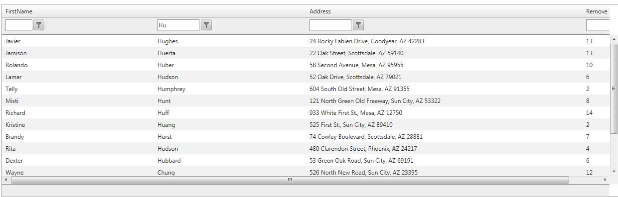 <%@ Page Language="C#" AutoEventWireup="true" CodeFile="Z_GridTest.aspx.cs" Inherits="Z_GridTest" %><!DOCTYPE html PUBLIC "-//W3C//DTD XHTML 1.0 Transitional//EN" "http://www.w3.org/TR/xhtml1/DTD/xhtml1-transitional.dtd"><html xmlns="http://www.w3.org/1999/xhtml"><head runat="server"> <title></title></head><body> <form id="form1" runat="server"> <telerik:RadScriptManager ID="RadScriptManager1" runat="server" /> <!-- content start --> <telerik:RadAjaxManager ID="RadAjaxManager1" runat="server"> <AjaxSettings> <telerik:AjaxSetting AjaxControlID="SignersGrid"> <UpdatedControls> <telerik:AjaxUpdatedControl ControlID="SignersGrid" LoadingPanelID="RadAjaxLoadingPanel1" /> </UpdatedControls> </telerik:AjaxSetting> </AjaxSettings> </telerik:RadAjaxManager> <telerik:RadAjaxLoadingPanel ID="RadAjaxLoadingPanel1" runat="server" /> <div> <telerik:RadGrid AutoGenerateColumns="false" ID="SignersGrid" runat="server" Width="99.7%" AllowSorting="true" AllowFilteringByColumn="true" EnableLinqExpressions="false" AllowPaging="false" PageSize="15" BorderWidth="1px" BorderColor="#999999" EnableEmbeddedSkins="true" Skin="Default" DataSourceID="SQLDataSource1" ShowFooter="True" GridLines="None" > <PagerStyle Mode="NextPrevAndNumeric" /> <GroupingSettings CaseSensitive="false" /> <MasterTableView AutoGenerateColumns="false" EditMode="InPlace" AllowFilteringByColumn="True" ShowFooter="True" TableLayout="Auto"> <Columns> <telerik:GridBoundColumn FilterControlWidth="50px" HeaderText="FirstName" UniqueName="FirstName" DataField="FirstName" SortExpression="FirstName" > </telerik:GridBoundColumn> <telerik:GridBoundColumn UniqueName="LastName" Visible="true" DataField="LastName" SortExpression="LastName" > </telerik:GridBoundColumn> <telerik:GridBoundColumn UniqueName="VoterAddress" HeaderText="Address" DataField="Address" SortExpression="Address" > </telerik:GridBoundColumn > <telerik:GridBoundColumn UniqueName="RemoveSignature" HeaderText="Remove" DataField="CountyId" > </telerik:GridBoundColumn> <telerik:GridBoundColumn UniqueName="MiddleName" Visible="false" DataField="MiddleName" > </telerik:GridBoundColumn> <telerik:GridBoundColumn UniqueName="NameSuffix" Visible="false" DataField="NameSuffix" > </telerik:GridBoundColumn> </Columns> </MasterTableView> <ClientSettings> <Scrolling AllowScroll="true" UseStaticHeaders="true" /> </ClientSettings> </telerik:RadGrid> <asp:SqlDataSource ID="SqlDataSource1" ConnectionString="<%$ ConnectionStrings:ElectronicPetitionSystemConnectionString %>" SelectCommand="SELECT VoterSignatureId, PetitionId, LastName, FirstName, MiddleName, NameSuffix, [Address], CountyId, Email, SignatureImage, CountyVoterId, MvdSerialNumber, DateSigned, ClientIpAddress, VoterSignatureStatusId, CreatedDate, ModifiedDate FROM VoterSignatures WHERE PetitionId = 1001" ProviderName="System.Data.SqlClient" runat="server"> </asp:SqlDataSource> </div> </form></body></html>The code below is the "full version" including the display of the "master" fields. This page does contain one statement in the Page_Init event (not a postback only) which sets the value of the Select Command based on the value of a request qeury string member.