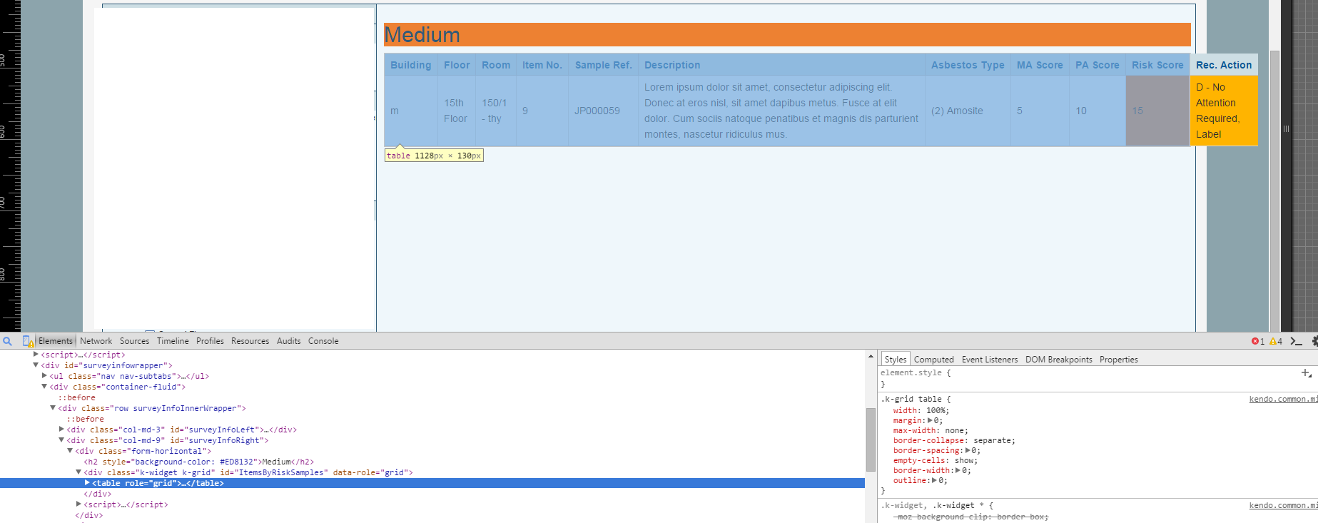 I'm having trouble with a Kendo grid resizing. Basically, the content is extending beyond the width of my table, when the content should be wrapping instead. I've added a screenshot to try and display the issue - the 'Description' column should be wrapping but instead isn't and the table content therefore is going beyond the width of the div the table sits in. Furthermore, using the debug tools in Chrome shows that the table itself is positioned correctly, but it's the th and td cells which are displaying outside of the table area (hopefully the screenshot demonstrates that too). The code I am using in my view is fairly basic :-