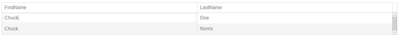 var data = new Array();data.push({FirstName: 'John', LastName: 'Doe',});data.push({FirstName: 'Chuck', LastName: 'Norris',});var grid = $("#grid").kendoGrid({ dataSource: { data: data, schema: { model: { fields: { FirstName: { type: "string" }, LastName: { type: "string" }, } } }, }, editable: true, columns: [ { field: "FirstName", }, { field: "LastName", }, ],}).data("kendoGrid");Grid is displayed correctly. But when I try to edit the first row, data from the second appears in field.
