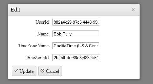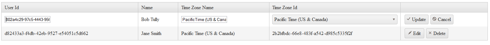 2. Secondly, how do you manage this properly? I needed a TimeZoneName to show the name in the grid, but in order to preserve a timeZoneId when creating or editing a user, I need to have a TimeZoneId field on the model as well. So, how do you show just the TimeZoneName when displaying while hiding the TimeZoneId. Then hiding the TimeZoneName when editing and showing the TimeZoneId with a dropdown. It doesn't appear this is thought through very well here. How is everyone else handling this?