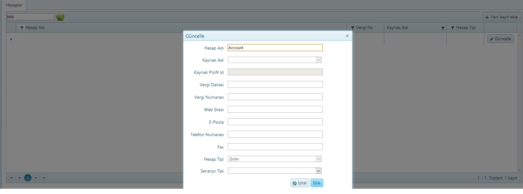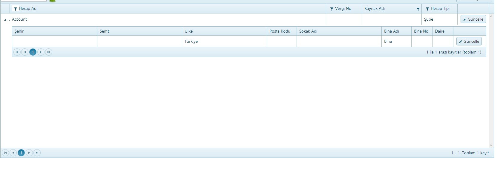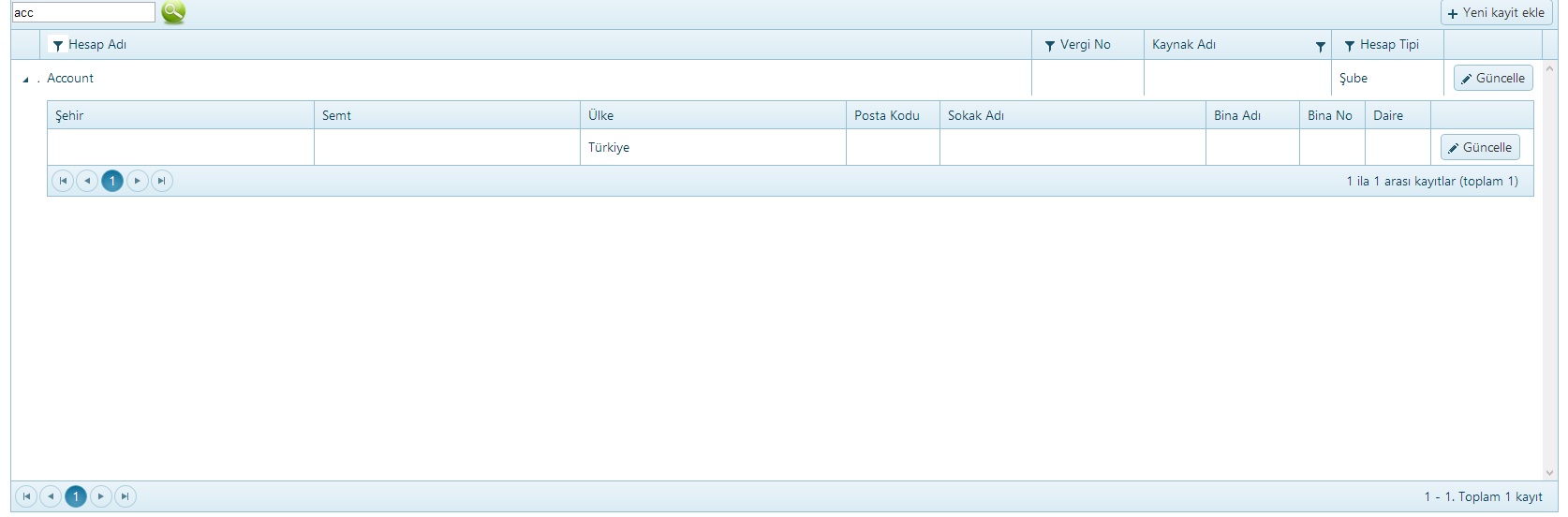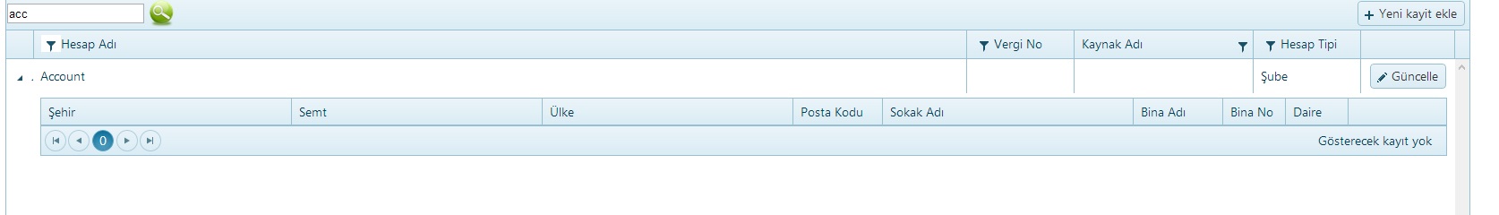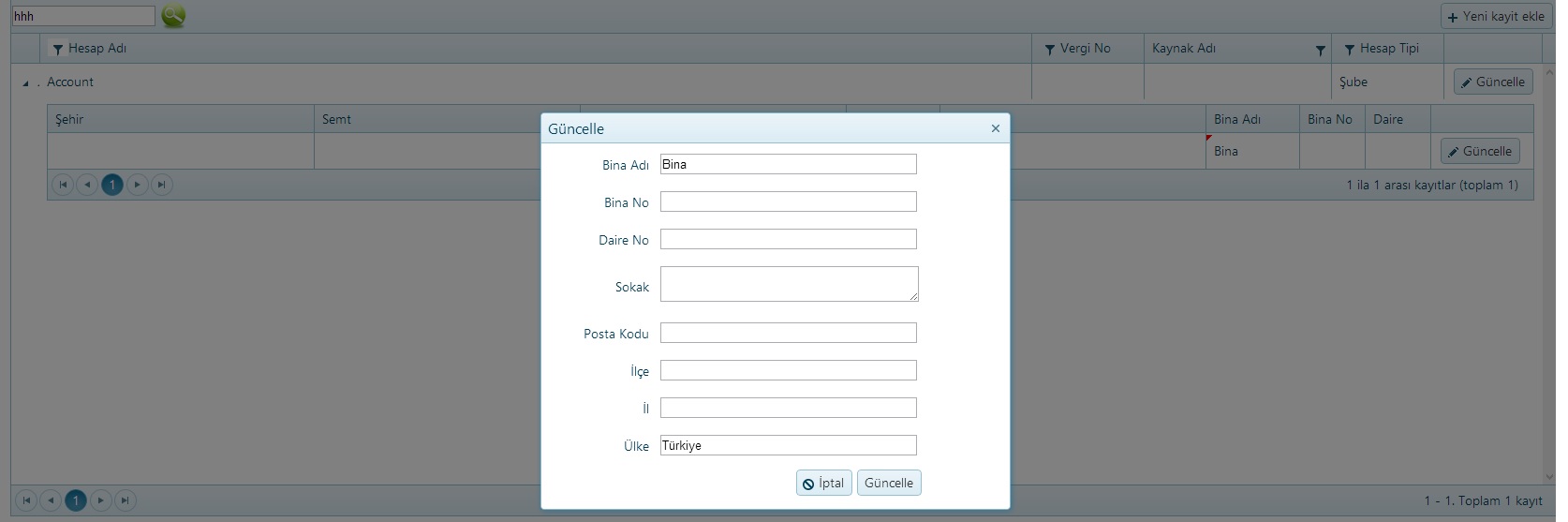 [HttpPost] public ActionResult AccountPopup_Create([DataSourceRequest] DataSourceRequest request, Account account ) { var result; return new JsonResult() { Data = result }; } [HttpPost] public ActionResult AccountPopup_Update([DataSourceRequest] DataSourceRequest request, Account account ) { var result; return new JsonResult() { Data = result }; }@model Account<table> <tr class="nameEditor"> <td class="editor-label">Dosya Adı </td> <td class="editor-field"> @Html.TextBoxFor(model => model.Name, new { disabled = "disabled" }) </td> </tr> <tr class="nameEditor"> <td class="editor-label">Kaynak Adı </td> <td class="editor-field"> @Html.DropDownListFor(model => model.SourceId, new SelectList(GetSources(), "IntId", "Name"), new { disabled = "disabled" }) </td> </tr> <tr class="nameEditor"> <td class="editor-label">Kaynak Profil Id </td> <td class="editor-field"> @Html.TextBoxFor(model => model.SourceAccountId, new { disabled = "disabled" }) </td> </tr> <tr class="nameEditor"> <td class="editor-label">Vergi Dairesi </td> <td class="editor-field"> @Html.TextBoxFor(model => model.TaxOffice, new { disabled = "disabled" }) </td> </tr> <tr class="nameEditor"> <td class="editor-label">Vergi Numarası </td> <td class="editor-field"> @Html.TextBoxFor(model => model.TaxNo, new { disabled = "disabled" }) </td> </tr> <tr class="nameEditor"> <td class="editor-label">Web Sitesi </td> <td class="editor-field"> @Html.TextBoxFor(model => model.Website, new { disabled = "disabled" }) </td> </tr> <tr class="nameEditor"> <td class="editor-label">E-Posta </td> <td class="editor-field"> @Html.TextBoxFor(model => model.EMail, new { disabled = "disabled" }) </td> </tr> <tr class="nameEditor"> <td class="editor-label">Telefon Numarası </td> <td class="editor-field"> @Html.TextBoxFor(model => model.Tel, new { disabled = "disabled" }) </td> </tr> <tr class="nameEditor"> <td class="editor-label">Fax </td> <td class="editor-field"> @Html.TextBoxFor(model => model.Fax, new { disabled = "disabled" }) </td> </tr> <tr class="nameEditor"> <td class="editor-label">Profil Çeşidi </td> <td class="editor-field"> @Html.DropDownListFor(model => model.AccountType, new SelectList(ConfigModel.EnumToSelectList(typeof(AccountType)), "Value", "Text"), new { disabled = "disabled" }) </td> </tr> <tr class="nameEditor"> <td class="editor-label">Senaryo Tipi </td> <td class="editor-field"> @Html.DropDownListFor(model => model.ScenarioType, new SelectList(ConfigModel.EnumToSelectList(typeof(ScenarioType)), "Value", "Text")) </td> </tr> <tr> <td colspan="2" style="height: 10px;"></td> </tr> <tr> <td colspan="2" style="padding-left: 20px;"><strong>Adres</strong></td> </tr> <tr> <td colspan="2" style="height: 10px;"></td> </tr> <tr class="nameEditor"> <td class="editor-label">Bina Adı </td> <td class="editor-field"> @Html.TextBoxFor(model => model.Addresses[0].CityName) </td> </tr> <tr class="nameEditor"> <td class="editor-label">Hesap Adı </td> <td class="editor-field"> @Html.TextBoxFor(model => model.Addresses[0].AccountId) </td> </tr> <tr class="nameEditor"> <td class="editor-label">Mahalle Adı </td> <td class="editor-field"> @Html.TextBoxFor(model => model.Addresses[0].CitySubdivisionName) </td> </tr> </table>@(Html.Kendo().Grid(GetAccounts(AccountType.Customer)) .Name("accountsGrid") .Columns(columns => { columns.Bound(Account => Account.Name).HeaderTemplate("Profil Adı").Filterable(filterable => filterable.UI("accountNameFilter")).HtmlAttributes(new { title = " #= Name # " }); columns.Bound(Account => Account.TaxNo).HeaderTemplate("Vergi No").Filterable(filterable => filterable.UI("taxNoFilter")).Width(120); columns.ForeignKey(Account => Account.SourceId, GetSources(), "IntId", "Name").Title("Kaynak Adı").Width(200); columns.Bound(Account => Account.AccountType).HeaderTemplate("Hesap Tipi").Width(120); columns.Command(command => { command.Edit().Text("Güncelle").UpdateText("Güncelle").CancelText("İptal"); }).Width(105); }) .Filterable(filterable => filterable .Extra(false) ) .ToolBar(toolbar => toolbar.Create().Text("Yeni kayit ekle")) .Editable(editable => editable.Mode(GridEditMode.PopUp).TemplateName("AccountEditPopup")) .Pageable(pager => pager .Messages(messages => messages.Display("{0} - {1}. Toplam {2} kayıt") .ItemsPerPage("") .First("İlk sayfa") .Last("Son sayfa") .Next("Sonraki") .Page("Sayfa") .Previous("Önceki") .Refresh("Yenile")) ) .Sortable() .Scrollable() .Events(e => e.Edit("onEdit")) .ClientDetailTemplateId("template") .DataSource(dataSource => dataSource .Ajax() .PageSize(30) .Model(model => { model.Id(p => p.IntId); }) .Events(events => events.Error("error_handler")) .Create(update => update.Action("AccountPopup_Create", "Config")) .Read(read => read.Action("AccountPopup_Read", "Config")) .Update(update => update.Action("AccountPopup_Update", "Config")) ) )