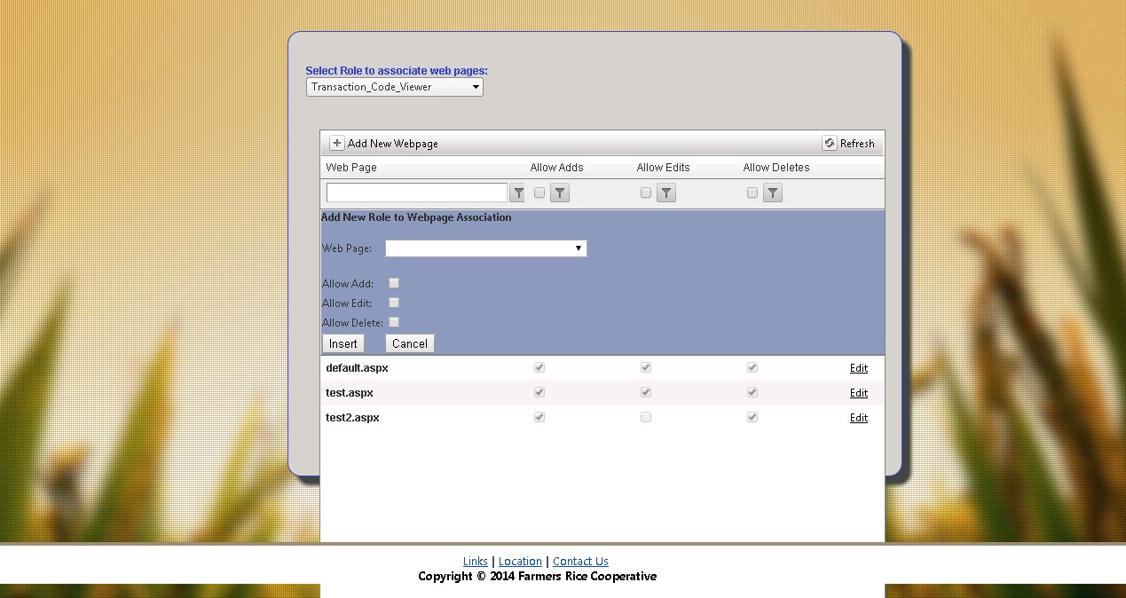 <div class="WebpageManagementBox"> <br /><br /> <asp:Label ID="lblRolePrompt" Text="Select Role to associate web pages:" CssClass="box_Labels" runat="server"></asp:Label> <br /> <telerik:RadDropDownList ID="ddlRoles" runat="server" CssClass="wepageManagementDropDown" Width="200px" DataTextField="role" DataValueField="ID" AutoPostBack="true" OnItemSelected="ddlRoles_ItemSelected"></telerik:RadDropDownList> <br /> <br /> <telerik:RadGrid ID="RadGridwebpagemanagement" CssClass="webpageManagementGrid" MasterTableView-DataKeyNames="ID" runat="server" AllowFilteringByColumn="True" AllowSorting="True" GroupPanelPosition="Top" OnNeedDataSource="RadGridwebpagemanagement_NeedDataSource" OnUpdateCommand="RadGridwebpagemanagement_UpdateCommand" OnItemDataBound="RadGridwebpagemanagement_ItemDataBound" OnDeleteCommand="RadGridwebpagemanagement_DeleteCommand" OnInsertCommand="RadGridwebpagemanagement_InsertCommand" OnItemCommand="RadGridwebpagemanagement_ItemCommand" OnPreRender="RadGridwebpagemanagement_PreRender"> <ClientSettings> <Scrolling AllowScroll="True" UseStaticHeaders="True" /> <Selecting AllowRowSelect="true" /> </ClientSettings> <GroupingSettings CaseSensitive="false" /> <MasterTableView AutoGenerateColumns="false" CommandItemDisplay="Top" CommandItemSettings-AddNewRecordText="Add New Webpage" InsertItemPageIndexAction="ShowItemOnCurrentPage"> <columns> <telerik:GridBoundColumn DataField="webpage_name" HeaderText="Web Page" UniqueName="webpage_name" ItemStyle-Font-Names="Arial" ItemStyle-Font-Bold="true" FilterControlWidth="200px"> <HeaderStyle Width="230px" Font-Names="Arial" /> <ItemStyle Width="230px" /> </telerik:GridBoundColumn> <telerik:GridCheckBoxColumn DataField="add_privledge" HeaderText="Allow Adds" UniqueName="add_privledge" FilterControlWidth="120px"> <HeaderStyle Width="120px" Font-Names="Arial" /> <ItemStyle Width="120px" /> </telerik:GridCheckBoxColumn> <telerik:GridCheckBoxColumn DataField="edit_privledge" HeaderText="Allow Edits" UniqueName="edit_privledge" FilterControlWidth="120px"> <HeaderStyle Width="120px" Font-Names="Arial" /> <ItemStyle Width="120px" /> </telerik:GridCheckBoxColumn> <telerik:GridCheckBoxColumn DataField="delete_privledge" HeaderText="Allow Deletes" UniqueName="delete_privledge" FilterControlWidth="120px"> <HeaderStyle Width="120px" Font-Names="Arial" /> <ItemStyle Width="120px" /> </telerik:GridCheckBoxColumn> <telerik:GridEditCommandColumn ButtonType="LinkButton" EditText="Edit" CancelText="Cancel" ItemStyle-Width="50px" HeaderStyle-Width="50px" FilterControlWidth="50px" /> <telerik:GridButtonColumn ConfirmText="Delete this product?" ConfirmDialogType="RadWindow" ConfirmTitle="Delete" ButtonType="LinkButton" Text="Delete" CommandName="Delete" ItemStyle-Width="50px" HeaderStyle-Width="50px" FilterControlWidth="50px" /> </columns> <EditFormSettings EditFormType="Template"> <FormTemplate> <div id="divGridEdit" class="divGrid"> <b>Add New Role to Webpage Association</b> <br /><br /> <table> <tr> <td><asp:Label Text="Web Page:" runat="server"></asp:Label></td> <td> <asp:DropDownList ID="ddlWebPages" DataSourceID='sqlDataSourceWebpages' AppendDataBoundItems="True" DataTextField="webpage_name" DataValueField="ID" SelectedValue='<%# Bind("security_webpage_id") %>' runat="server"> <asp:ListItem Text=" " Value=""></asp:ListItem> </asp:DropDownList> </td> </tr> <tr> <td><br /></td> <td></td> </tr> <tr> <td><asp:Label Text="Allow Add:" runat="server"></asp:Label></td> <td><uc1:CheckBoxNullableChecked ID="chkboxAllowAdd" Checked='<%# Bind("add_privledge") %>' runat="server" /> </td> </tr> <tr> <td><asp:Label Text="Allow Edit:" runat="server"></asp:Label></td> <td><uc1:CheckBoxNullableChecked ID="chkboxAllowEdit" Checked='<%# Bind("edit_privledge") %>' runat="server" /> </td> </tr> <tr> <td><asp:Label Text="Allow Delete:" runat="server"></asp:Label></td> <td><uc1:CheckBoxNullableChecked ID="chkboxAllowDelete" Checked='<%# Bind("delete_privledge") %>' runat="server" /></td> </tr> <tr> <td><asp:Button ID="btnUpdate" Text='<%# (Container is GridEditFormInsertItem) ? "Insert" : "Update" %>' CommandName='<%# (Container is GridEditFormInsertItem) ? "PerformInsert" : "Update" %>' runat="server" /></td> <td><asp:Button ID="btnCancel" Text="Cancel" runat="server" CommandName="Cancel" CausesValidation="false" /></td> </tr> </table> </div> </FormTemplate> </EditFormSettings> </MasterTableView> <ClientSettings> <ClientEvents OnRowDblClick="rowDblClick" /> </ClientSettings> </telerik:RadGrid> </div>Here is the css for the div and the grid.