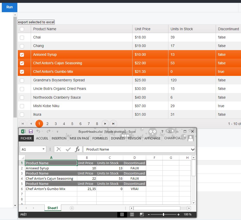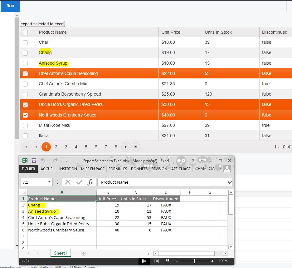In this dojo, i want to export selected rows to excel with exportSelectedToExcel(true). Rows are selected by clicking checkboxes.