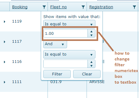 How can i change the the grid filter format of numeric textbox to just textbox for integer column.