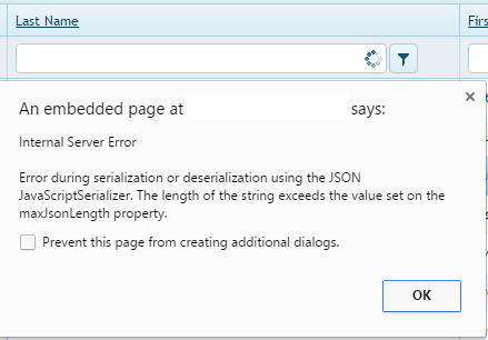 Since I have a lot more data than the demo here (15,000 people), loading all the auto complete from the filter the moment one character is typed in will result in a very slow and bad user experience, and often times it will pop up a window like the screenshot telling me "Error during serialization or deserialization using the JSON JavaScriptSerializer. The length of the string exceeds the value set on the maxJsonLength property."
