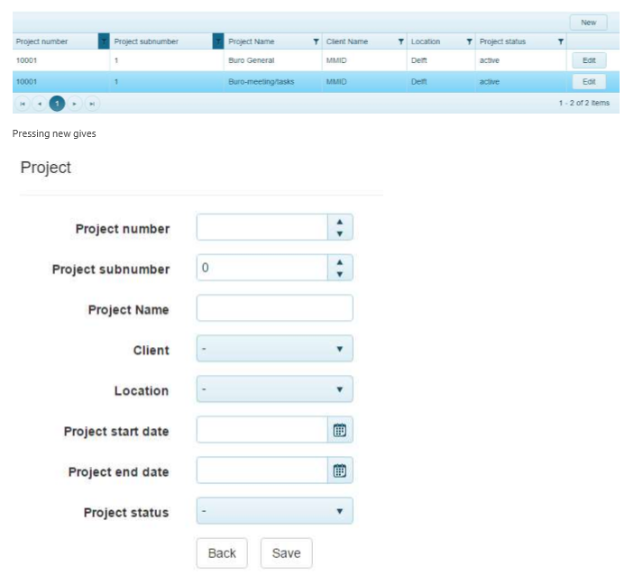 I have filtered on Project Number and Project Subnumber and pressed new which give me the bottom part of the image on a new webpage.