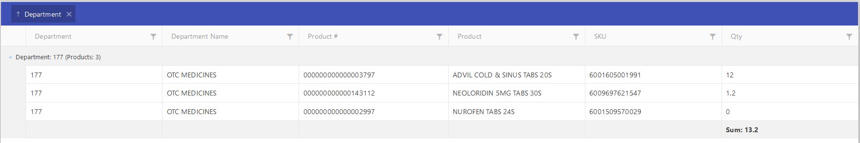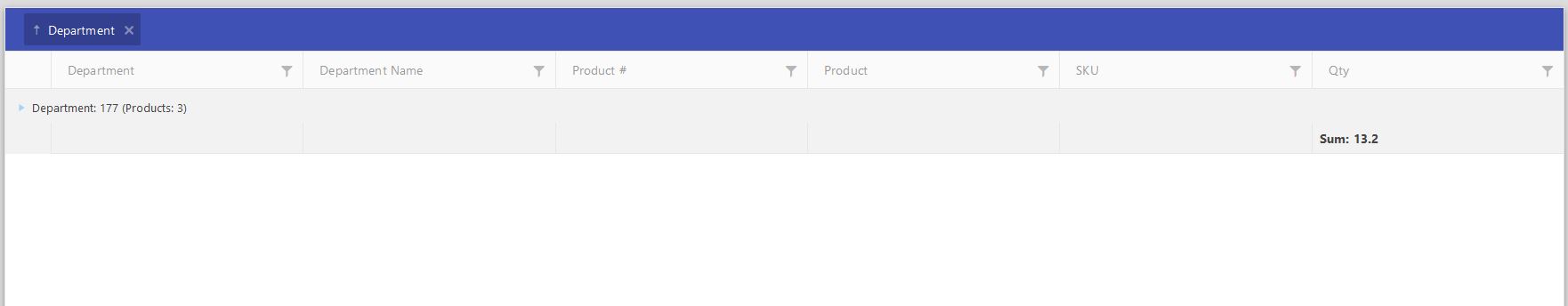@(Html.Kendo().Grid<Models.DepartmentSummaryView> () .Name("grid") .HtmlAttributes(new { style = " height:700px !important;" }) .Columns(columns => { columns.Bound(p => p.DepartmentNo).Width(150).ClientGroupHeaderTemplate("Department: #= value # (Products: #= count#)"); columns.Bound(p => p.DepartmentName).Width(150).ClientGroupHeaderTemplate("Department: #= value # (Products: #= count#)"); columns.Bound(p => p.ProductNo).Width(150).ClientGroupHeaderTemplate("Product: #= value # (Count: #= count #)"); columns.Bound(p => p.ProductName).Width(150); columns.Bound(p => p.SKU).Width(150); columns.Bound(p => p.Qty).Width(150).ClientGroupHeaderColumnTemplate("Sum: #= sum #").ClientFooterTemplate("Sum: #= sum #"); }) .Filterable(filterable => filterable.Extra(false) //.Mode(GridFilterMode.Row) .Operators(operators => operators .ForString(str => str.Clear() .StartsWith("Starts with") .EndsWith("Ends with") .IsEqualTo("Is equal to") .IsNotEqualTo("Is not equal to") .Contains("Contains") .DoesNotContain("Doesn't contain") ))) //.Pageable() .Navigatable() .AutoBind(false) .Sortable() .Groupable() .Events(events => events.DataBound("onDataBound")) .Reorderable(reorderable => reorderable.Columns(true)) .DataSource(dataSource => dataSource .Custom() .Schema(schema => { schema.Data("Data"); schema.Total("Total"); }) .Events(events => events.Sync("sync_handler")) .Group(groups => groups.Add(p => p.DepartmentNo)) .Aggregates(aggregates => { aggregates.Add(p => p.DepartmentNo).Count(); aggregates.Add(p => p.DepartmentName).Count(); aggregates.Add(p => p.ProductNo).Count(); aggregates.Add(p => p.SKU).Count(); aggregates.Add(p => p.Qty).Sum(); }) .Transport(transport => { transport.Read(read => read.Url("/api/enquiries/departmentsummary) .DataType("json") .Type(HttpVerbs.Get) ); transport.Create(create => create.Url(Base.APIHostAddress + "/api/enquiries/post") .DataType("json") .Type(HttpVerbs.Post) .ContentType("application/json; charset=utf-8") ); transport.ParameterMap("parameterMap"); }) ))