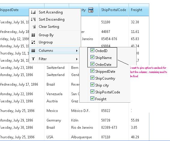 i want to give option to uncheck only limited field. for example grid containing orderid,order name,ship name,shipping date.