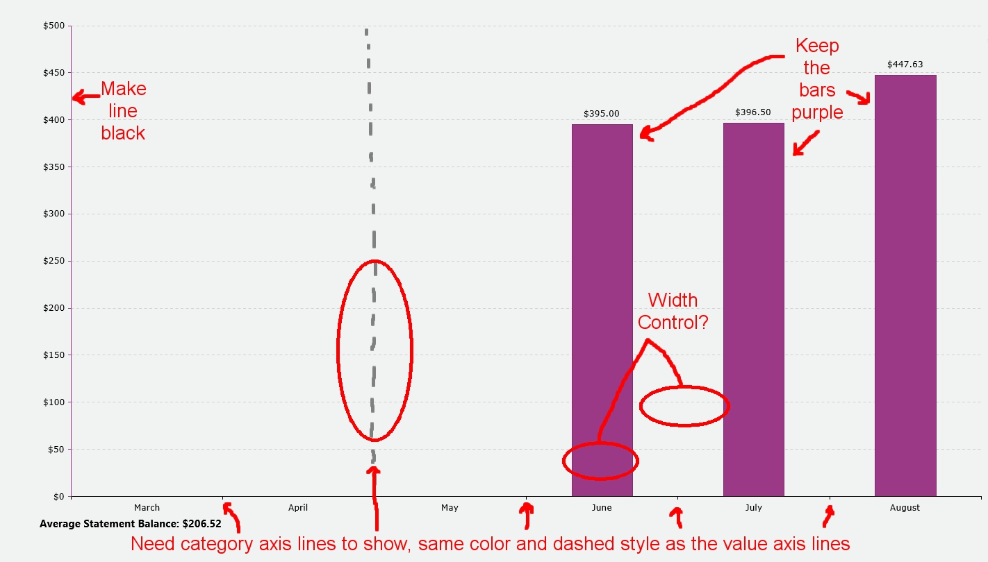 // This Is The RadChart Stacked 6 Month New Spending vs. Previous Balance History Chartvar telerikChartExampleRawData = "[{\"newSpending\":0,\"outstandingBalance\":0,\"totalBalance\":0,\"statementDate\":\"2013-03-01T08:00:00.000Z\",\"includeInAverageBalance\":false,\"month\":\"March\"},{\"newSpending\":0,\"outstandingBalance\":0,\"totalBalance\":0,\"statementDate\":\"2013-04-01T07:00:00.000Z\",\"includeInAverageBalance\":false,\"month\":\"April\"},{\"newSpending\":0,\"outstandingBalance\":0,\"totalBalance\":0,\"statementDate\":\"2013-05-01T07:00:00.000Z\",\"includeInAverageBalance\":false,\"month\":\"May\"},{\"newSpending\":395,\"outstandingBalance\":0,\"totalBalance\":395,\"statementDate\":\"2013-06-28T07:00:00.000Z\",\"includeInAverageBalance\":true,\"month\":\"June\"},{\"newSpending\":1.5,\"outstandingBalance\":395,\"totalBalance\":396.5,\"statementDate\":\"2013-07-05T07:00:00.000Z\",\"includeInAverageBalance\":true,\"month\":\"July\"},{\"newSpending\":101.13,\"outstandingBalance\":346.5,\"totalBalance\":447.63,\"statementDate\":\"2013-08-06T07:00:00.000Z\",\"includeInAverageBalance\":true,\"month\":\"August\"}]";var telerikChartExampleData = JSON.parse(telerikChartExampleRawData);var chartSectionCcStatementHistoryStacked = new Telerik.UI.RadChart(document.getElementById("chartSectionCcStatementHistory"), { dataSource: { data: telerikChartExampleData }, series: [ { type: "column", stacked: true, field: "outstandingBalance", color: "#D8B3D5", labels: { visible: false, font: "12px Verdana", color: "#000000", weight: "normal", template: "#=vw.Formatter.Currency.toCurrency(value)#", padding: -30 }, stack: true, }, { type: "column", stacked: true, field: "newSpending", color: "#9C3987", labels: { visible: false, font: "12px Verdana", color: "#000000", weight: "normal", template: "#=vw.Formatter.Currency.toCurrency(value)#" }, stack: true }], categoryAxis: { field: "month", color: "#000000", labels: { font: "12px Verdana", color: "#000000" }, majorTicks: { size: 0, visable: true }, minorTicks: { size: 0, visable: false } }, valueAxis: { field: "totalBalance", color: "#9C3987", labels: { font: "12px Verdana", color: "#000000", format: "${0}" }, majorGridLines: { visable: true }, minorGridLines: { color: "#FFFFFF", width: 0, visable: false }, visible: true }, plotArea: { border: { width: 0, color: "#000000" } }, seriesColors: ["#9C3987", "#D9B2D6"], theme: "light", background: "transparent"});CSS