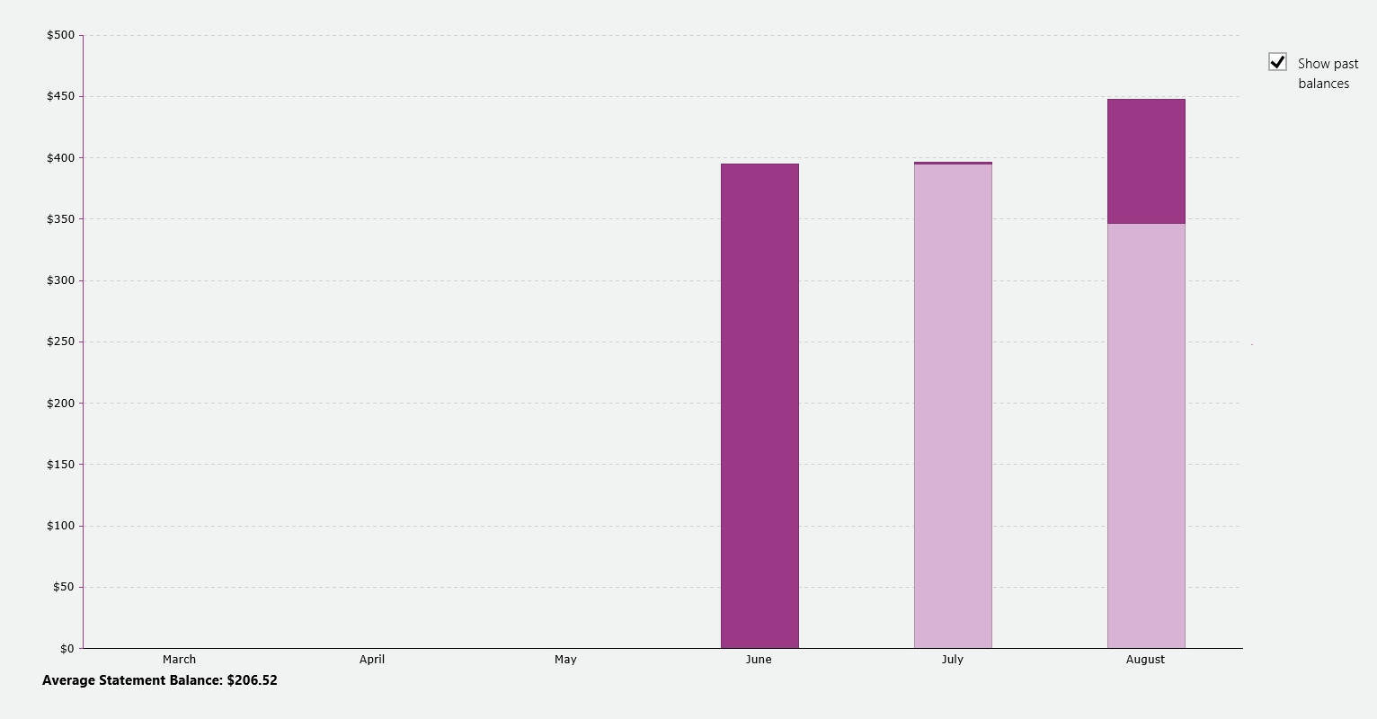 <body> <div class="ccStatement fragment"> <section id="peek"></section> <div id="ccSHSectionHeader"></div> <section aria-label="Main content" role="main" id="main"> <div id="ccStatementHistory"> <div id="chartSectionCcStatementHistory"></div> <div id="divCcSectionShowPastBal"> <div class="chkbox"> <input name="checkboxCcSectionChartType" value="1" type="checkbox"> Show past <br><span class="balance">balances</span> </div> </div> <div id="divCcSectionBalance"> Average Statement Balance: <span data-win-bind="innerText: cardStatementHistoryDetails.aveBalance"></span> </div> </div> </section> </div></body>JS - Initial bar chart