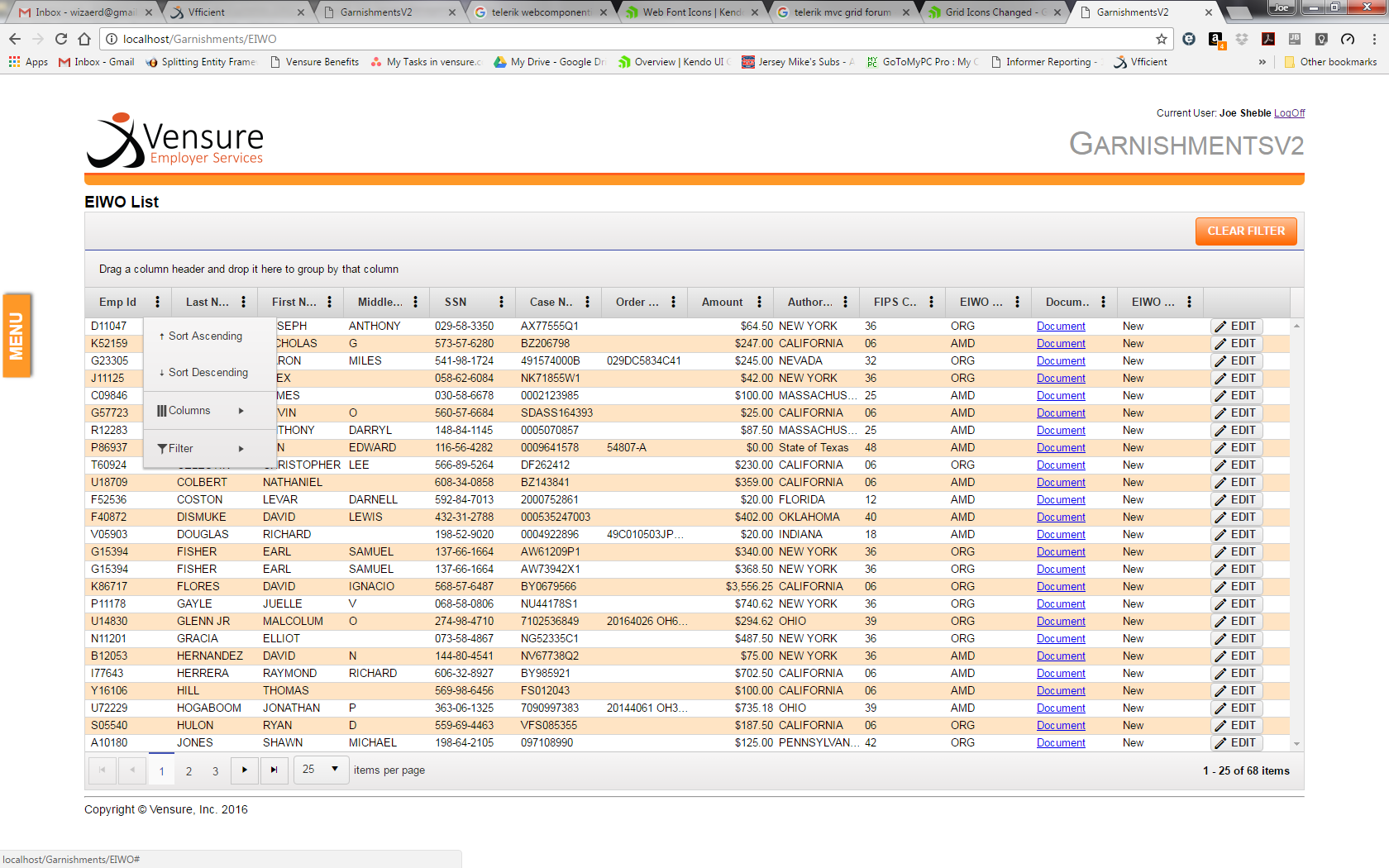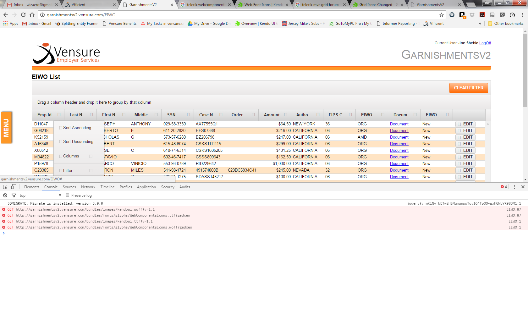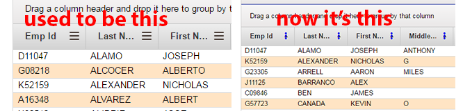 My app has progressed amazingly well, so I figured I'd create some chaos and update my Telerik MVC components. I went from 2016.3.1118 to 2017.1.223 and the resulting chaos was actually pretty minimal. Except for one thing, and I cannot quite seem to figure it out. My grid column header icons, for selecting columns and setting filters has changed from a black icon depicting 3 horizontal lines to what appears to be a blue arrow point upwards towards a dot. I've attached a screenshot.