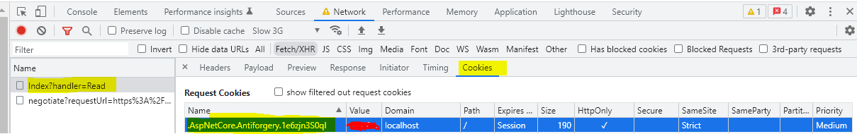 The anti-forgery token is there. I've attached the screenshot of the Read request's cookies.