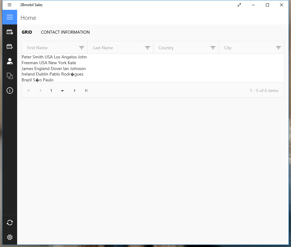 <div class="k-grid k-widget" data-role="grid" options="mainGridOptions" kendo-grid=""> <table role="grid"> <colgroup> <col style="width: 120px;"> <col style="width: 120px;"> <col style="width: 120px;"> <col style="width: 120px;"> </colgroup> <thead class="k-grid-header" role="rowgroup"> <tr role="row"> <th class="k-header ng-scope k-with-icon k-filterable" id="69535f48-2b16-4361-8789-e76926a9b994" role="columnheader" rowspan="1" data-role="columnsorter" data-index="0" data-title="First Name" data-field="FirstName"><a tabindex="-1" class="k-grid-filter" href="#"><span class="k-icon k-filter"></span></a><a class="k-link" href="#">First Name</a> </th> <th class="k-header ng-scope k-with-icon k-filterable" id="061ea52a-80c9-4ff5-94ce-cd04bca20299" role="columnheader" rowspan="1" data-role="columnsorter" data-index="1" data-title="Last Name" data-field="LastName"><a tabindex="-1" class="k-grid-filter" href="#"><span class="k-icon k-filter"></span></a><a class="k-link" href="#">Last Name</a> </th> <th class="k-header ng-scope k-with-icon k-filterable" id="b070ec5b-c42c-4027-b852-294bc2ff5a75" role="columnheader" rowspan="1" data-role="columnsorter" data-index="2" data-field="Country"><a tabindex="-1" class="k-grid-filter" href="#"><span class="k-icon k-filter"></span></a><a class="k-link" href="#">Country</a> </th> <th class="k-header ng-scope k-with-icon k-filterable" id="36f7ec08-cf1e-4f92-b3e9-28c4b7219fb6" role="columnheader" rowspan="1" data-role="columnsorter" data-index="3" data-field="City"><a tabindex="-1" class="k-grid-filter" href="#"><span class="k-icon k-filter"></span></a><a class="k-link" href="#">City</a> </th> </tr> </thead> <tbody role="rowgroup"> <span class="ng-scope">Peter</span> <span class="ng-scope">Smith</span> <span class="ng-scope">USA</span> <span class="ng-scope">Los Angelos</span> <span class="ng-scope">John</span> <span class="ng-scope">Freeman</span> <span class="ng-scope">USA</span> <span class="ng-scope">New York</span> <span class="ng-scope">Kate</span> <span class="ng-scope">James</span> <span class="ng-scope">England</span> <span class="ng-scope">Dover</span> <span class="ng-scope">Ian</span> <span class="ng-scope">Johnson</span> <span class="ng-scope">Ireland</span> <span class="ng-scope">Dublin</span> <span class="ng-scope">Pablo</span> <span class="ng-scope">Rodr�guez</span> <span class="ng-scope">Brazil</span> <span class="ng-scope">S�o Paulo</span> </tbody> </table> <div class="k-pager-wrap k-grid-pager k-widget k-floatwrap" data-role="pager"><a tabindex="-1" title="Go to the first page" class="k-link k-pager-nav k-pager-first k-state-disabled" href="#" data-page="1"><span class="k-icon k-i-seek-w">Go to the first page</span></a><a tabindex="-1" title="Go to the previous page" class="k-link k-pager-nav k-state-disabled" href="#" data-page="1"><span class="k-icon k-i-arrow-w">Go to the previous page</span></a> <ul class="k-pager-numbers k-reset"> <li class="k-current-page"><span class="k-link k-pager-nav">1</span> </li> <li><span class="k-state-selected">1</span> </li> <li><a tabindex="-1" class="k-link" href="#" data-page="2">2</a> </li> </ul><a tabindex="-1" title="Go to the next page" class="k-link k-pager-nav" href="#" data-page="2"><span class="k-icon k-i-arrow-e">Go to the next page</span></a><a tabindex="-1" title="Go to the last page" class="k-link k-pager-nav k-pager-last" href="#" data-page="2"><span class="k-icon k-i-seek-e">Go to the last page</span></a><span class="k-pager-info k-label">1 - 5 of 6 items</span> </div></div>The problem is that there are no <tr> and <td> elements in the table's tbody. This is not a standard Kendo Grid rendering, I suspect that some other directive modifies the HTML.