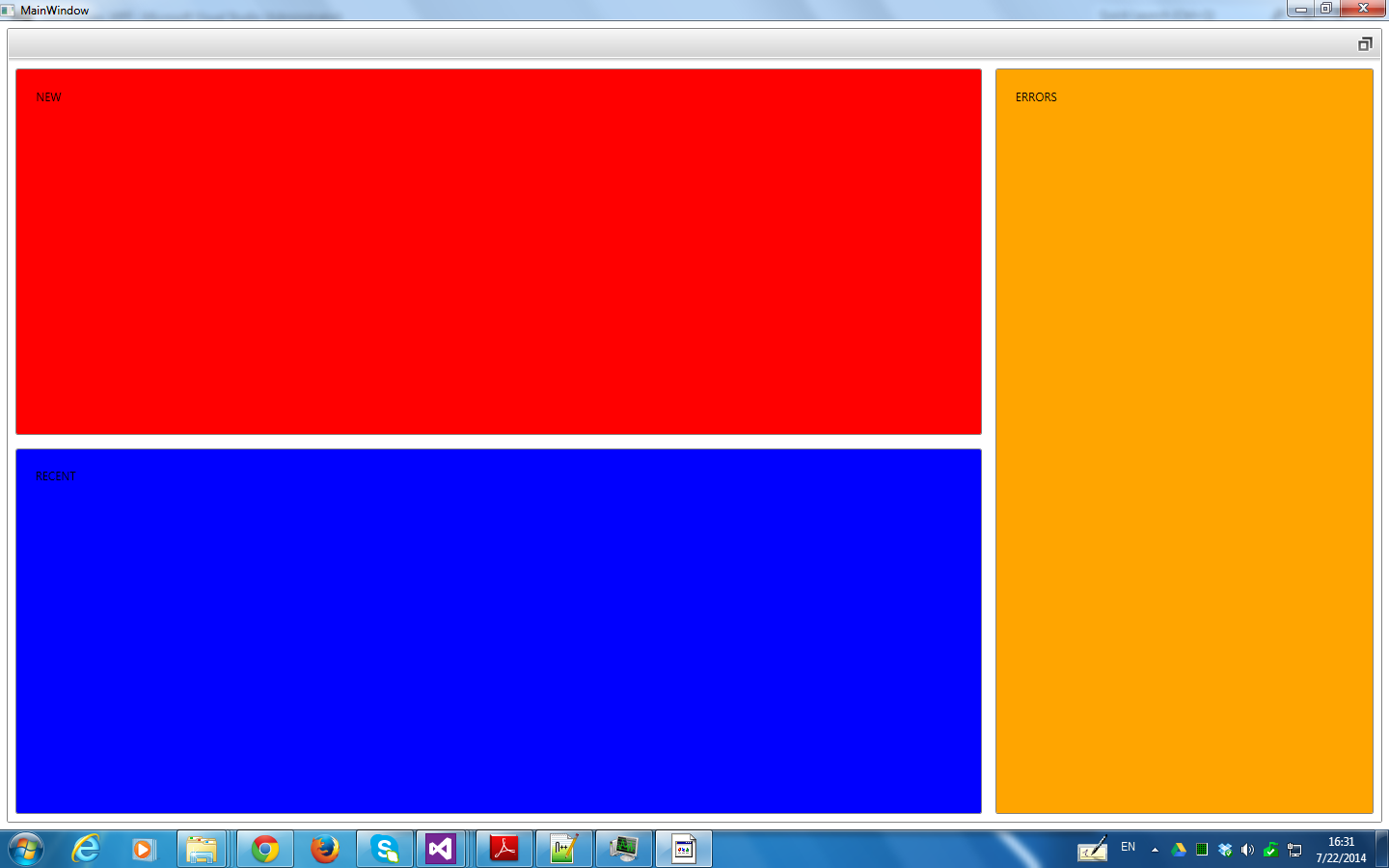 <telerik:RadTileView x:Name="tileView" > <Grid > <Grid.RowDefinitions> <RowDefinition /> <RowDefinition /> </Grid.RowDefinitions> <Grid.ColumnDefinitions> <ColumnDefinition Width="2.5*" /> <ColumnDefinition Width="*" /> </Grid.ColumnDefinitions> <telerik:RadTileViewItem Background="Red" Header="Item 0" Style="{DynamicResource RadTileViewItemStyle}" Grid.Row="0" Grid.Column="0" DataContext="{StaticResource NewTile}"/> <telerik:RadTileViewItem Background="Blue" Header="Item 0" Style="{DynamicResource RadTileViewItemStyle}" Grid.Row="1" Grid.Column="0" DataContext="{StaticResource RecentTile}"/><Grid> <telerik:RadTileViewItem Background="Orange" Header="Item 0" Style="{DynamicResource RadTileViewItemStyle}" Grid.Row="0" Grid.Column="1" Grid.RowSpan="2" DataContext="{StaticResource ErrorsTile}"/> </Grid> </telerik:RadTileView></Grid>But when I remove Grid inside TileView top bar disappears. Here is code without Grid and the result is displayed in TileWithoutGrid.png