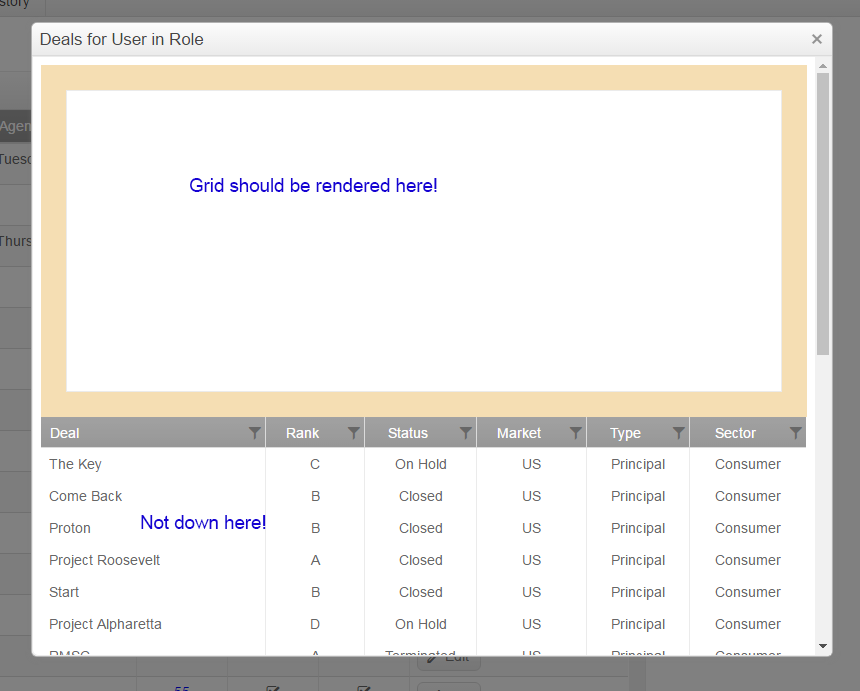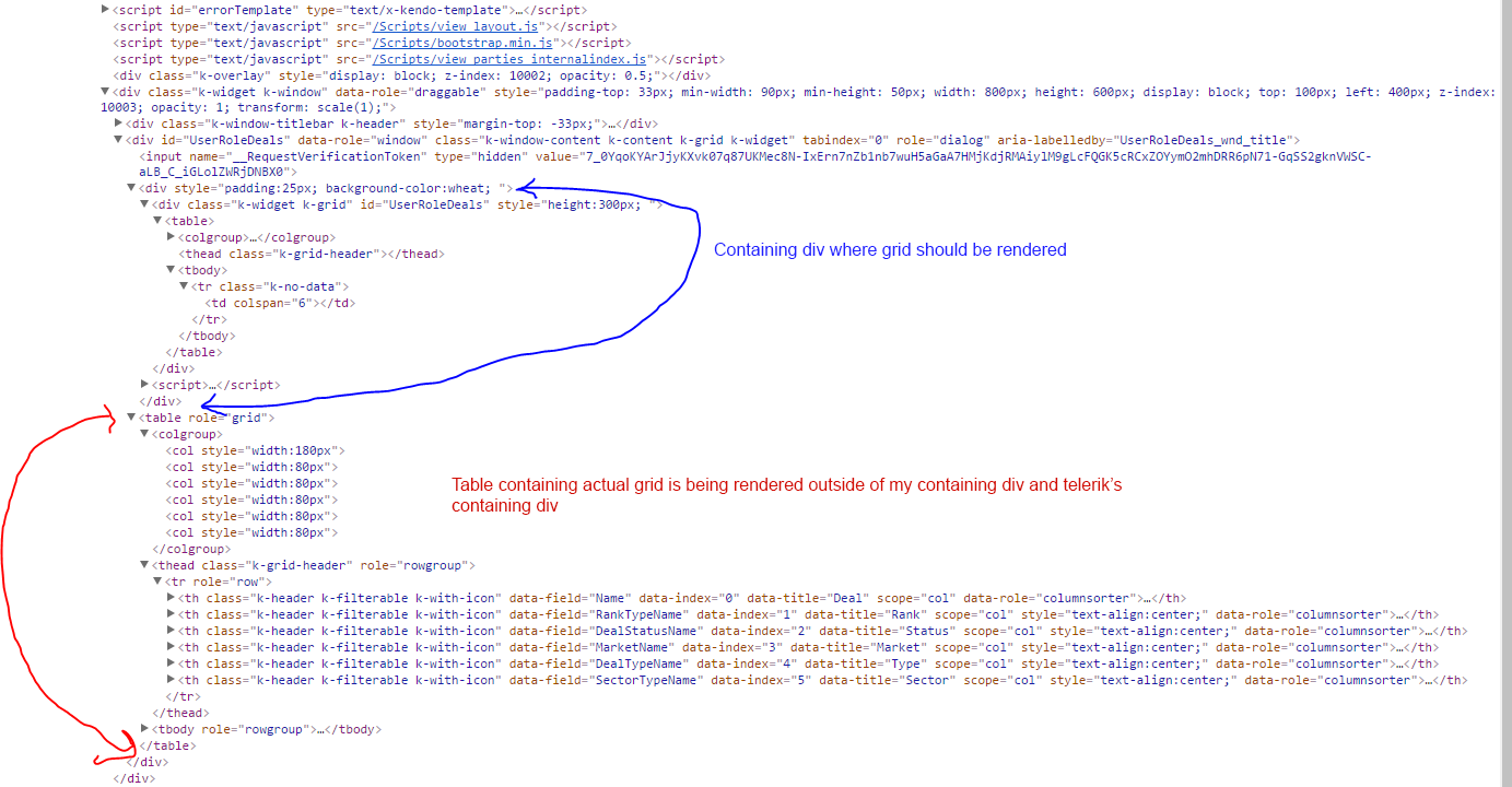 When it executes, the grid in the kendo window loads and populates, but does it outside of the containing grid. Inside of the containing div is kendo code that contains the k-no-data portion of the grid which displays on the page even though there is data displayed in the grid being rendered underneath. If I set the height of the grid it affects the k-no-data portion of the grid and not the grid with the data being rendered underneath. Please help.