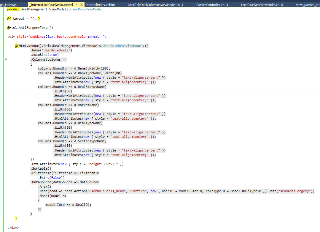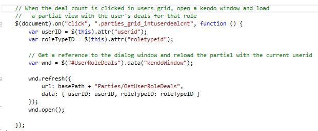 I have a view which contains a kendo grid. When a user clicks on a link in the grid I am calling some javascript that opens a Kendo window which loads a partial view containing another kendo grid. In the partial I have a div which contains the code for the grid.