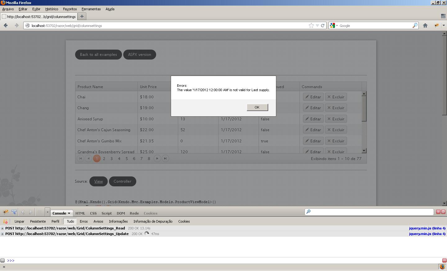 Something similar occurs on the example provided with Wrappers for KendoUI, Collumn Settings (http://localhost:53702/razor/web/grid/columnsettings). If I edit a row, change any field's value and click on Update, it looks like changes where accepted, but an alert is showed: "Errors: The value '1/17/2012 12:00:00 AM' is not valid for Last supply". I know I can fix it refering the right culture file, but it's not the main problem.