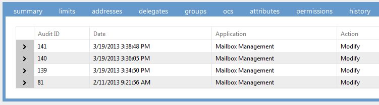<telerik:RadTabStrip ID="DetailsTabs" runat="server" MultiPageID="DetailViews" SelectedIndex="0"> <Tabs> <telerik:RadTab Text="Summary" Selected="True" /> <telerik:RadTab Text="Limits" /> <telerik:RadTab Text="Addresses" /> <telerik:RadTab Text="Delegates" /> <telerik:RadTab Text="Groups" /> <telerik:RadTab Text="OCS" /> <telerik:RadTab Text="Attributes" /> <telerik:RadTab Text="Permissions" /> <telerik:RadTab Text="History" /> <telerik:RadTab Text="Audit" /> </Tabs></telerik:RadTabStrip><telerik:RadMultiPage ID="DetailViews" runat="server" SelectedIndex="0" RenderSelectedPageOnly="false" CssClass="multi-view"> <telerik:RadPageView ID="SummaryView" runat="server"> <asp:DetailsView ID="SummaryGrid" runat="server" AllowPaging="false" Width="100%" AutoGenerateRows="false" BorderWidth="0" CssClass="detailsview"> <FieldHeaderStyle Font-Bold="true" Wrap="false" /> <Fields> <asp:BoundField HeaderText="Display Name" DataField="DisplayName" ItemStyle-HorizontalAlign="Right" /> <asp:BoundField HeaderText="Account Name" DataField="AccountName" ItemStyle-HorizontalAlign="Right" /> <asp:BoundField HeaderText="Exchange Alias" DataField="ExchangeAlias" ItemStyle-HorizontalAlign="Right" /> <asp:BoundField HeaderText="Exchange Server" DataField="ExchangeServer" ItemStyle-HorizontalAlign="Right" /> <asp:BoundField HeaderText="Exchange Database" DataField="ExchangeDatabase" ItemStyle-HorizontalAlign="Right" /> <asp:BoundField HeaderText="Email Address" DataField="EmailAddress" ItemStyle-HorizontalAlign="Right" /> <asp:CheckBoxField HeaderText="Account Locked" DataField="AccountLocked" ItemStyle-HorizontalAlign="Right" /> </Fields> </asp:DetailsView> </telerik:RadPageView> <telerik:RadPageView ID="LimitsView" runat="server"> <asp:DetailsView ID="LimitsGrid" runat="server" AllowPaging="false" Width="100%" AutoGenerateRows="false" BorderWidth="0" CssClass="detailsview"> <FieldHeaderStyle Font-Bold="true" Wrap="false" /> <Fields> <asp:BoundField HeaderText="Mailbox Size (KB)" DataField="MailboxSize" ItemStyle-HorizontalAlign="Right" /> <asp:BoundField HeaderText="Number of Items" DataField="TotalItems" ItemStyle-HorizontalAlign="Right" /> <asp:CheckBoxField HeaderText="Default Quota Limits" DataField="DefaultQuota" ItemStyle-HorizontalAlign="Right" /> <asp:BoundField HeaderText="Issue Warning Limit (KB)" DataField="WarningLimit" ItemStyle-HorizontalAlign="Right" /> <asp:BoundField HeaderText="Prohibit Send Limit (KB)" DataField="SendLimit" ItemStyle-HorizontalAlign="Right" /> <asp:BoundField HeaderText="Disable Mailbox Limit (KB)" DataField="DisableLimit" ItemStyle-HorizontalAlign="Right" /> <asp:BoundField HeaderText="Send Size Limit (KB)" DataField="SendSizeLimit" ItemStyle-HorizontalAlign="Right" /> <asp:BoundField HeaderText="Receive Size Limit (KB)" DataField="ReceiveSizeLimit" ItemStyle-HorizontalAlign="Right" /> <asp:BoundField HeaderText="Recipient Limit" DataField="RecipientLimit" ItemStyle-HorizontalAlign="Right" /> <asp:BoundField HeaderText="Mailbox Status" DataField="MailboxStatus" ItemStyle-HorizontalAlign="Right" /> </Fields> </asp:DetailsView> </telerik:RadPageView> <telerik:RadPageView ID="AddressesView" runat="server"> <div> <asp:DetailsView ID="AddressesGrid" runat="server" AllowPaging="false" Width="100%" AutoGenerateRows="false" BorderWidth="0" CssClass="detailsview"> <FieldHeaderStyle Font-Bold="true" Wrap="false" /> <Fields> <asp:BoundField HeaderText="Legacy Address" DataField="LegacyAddress" ItemStyle-HorizontalAlign="Right" /> <asp:CheckBoxField HeaderText="Address Hidden" DataField="AddressHidden" ItemStyle-HorizontalAlign="Right" /> <asp:BoundField HeaderText="Forwarding Address" DataField="ForwardingAddress" ItemStyle-HorizontalAlign="Right" /> <asp:BoundField HeaderText="Target Address" DataField="TargetAddress" ItemStyle-HorizontalAlign="Right" /> </Fields> </asp:DetailsView> </div> <div class="new-block-20"> <telerik:RadGrid ID="ProxiesGrid" runat="server" AutoGenerateColumns="false"> <MasterTableView CommandItemDisplay="None"> <NoRecordsTemplate> <div class="no-records"> No records to display. </div> </NoRecordsTemplate> <Columns> <telerik:GridBoundColumn DataField="ProxyAddress" HeaderText="Proxy Address List" /> </Columns> </MasterTableView> </telerik:RadGrid> </div> </telerik:RadPageView> <telerik:RadPageView ID="DelegatesView" runat="server"> <div class="col-50"> <telerik:RadGrid ID="DelegatesOfGrid" runat="server" AutoGenerateColumns="false"> <MasterTableView CommandItemDisplay="None"> <NoRecordsTemplate> <div class="no-records"> No records to display. </div> </NoRecordsTemplate> <Columns> <telerik:GridBoundColumn DataField="Delegate" HeaderText="Delegates of this Mailbox" /> </Columns> </MasterTableView> </telerik:RadGrid> </div> <div class="col-50 gutter"> <telerik:RadGrid ID="DelegatesForGrid" runat="server" AutoGenerateColumns="false"> <MasterTableView CommandItemDisplay="None"> <NoRecordsTemplate> <div class="no-records"> No records to display. </div> </NoRecordsTemplate> <Columns> <telerik:GridBoundColumn DataField="Delegate" HeaderText="Delegate for these Mailboxes" /> </Columns> </MasterTableView> </telerik:RadGrid> </div> </telerik:RadPageView> <telerik:RadPageView ID="GroupsView" runat="server"> <telerik:RadGrid ID="GroupsGrid" runat="server" AutoGenerateColumns="false"> <MasterTableView CommandItemDisplay="None"> <NoRecordsTemplate> <div class="no-records"> No records to display. </div> </NoRecordsTemplate> <Columns> <telerik:GridBoundColumn DataField="GroupName" HeaderText="Member of the Following Groups" /> </Columns> </MasterTableView> </telerik:RadGrid> </telerik:RadPageView> <telerik:RadPageView ID="OCSView" runat="server"> <asp:DetailsView ID="OCSGrid" runat="server" AllowPaging="false" Width="100%" AutoGenerateRows="false" BorderWidth="0" CssClass="detailsview"> <FieldHeaderStyle Font-Bold="true" Wrap="false" /> <Fields> <asp:CheckBoxField HeaderText="Enabled for OCS" DataField="EnabledOCS" ItemStyle-HorizontalAlign="Right" /> <asp:CheckBoxField HeaderTex