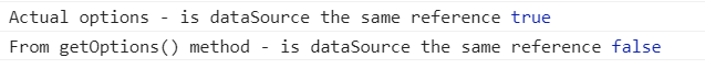 console.log("From getOptions() method - is dataSource the same reference", options.dataSource === dataSource1)So in summary, the approach would be to assign the shared dataSource instance by its name before using the setOptions() method as you mentioned in your original post. I will log a task for the team to update the getOptions() method API with a note that describes this behaviour: