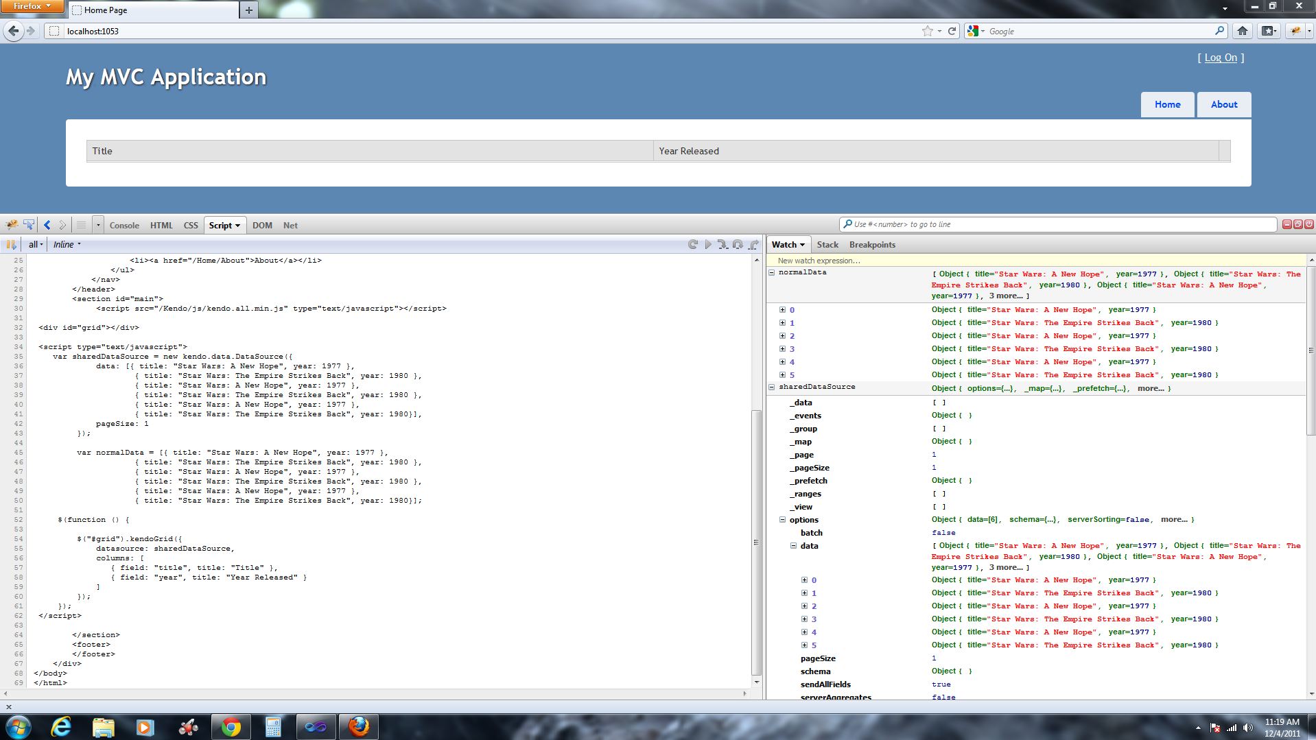 I'm trying to experiment with this grid to see if these kendo tools could be useful in our enterprise MVC 3 environment. I started up a new MVC 3 app in visual studio and added stylesheet links and jquery 1.6.2 to the head section in _Layout. Then dropped a kendo script reference in the index page and added some code to use the grid.