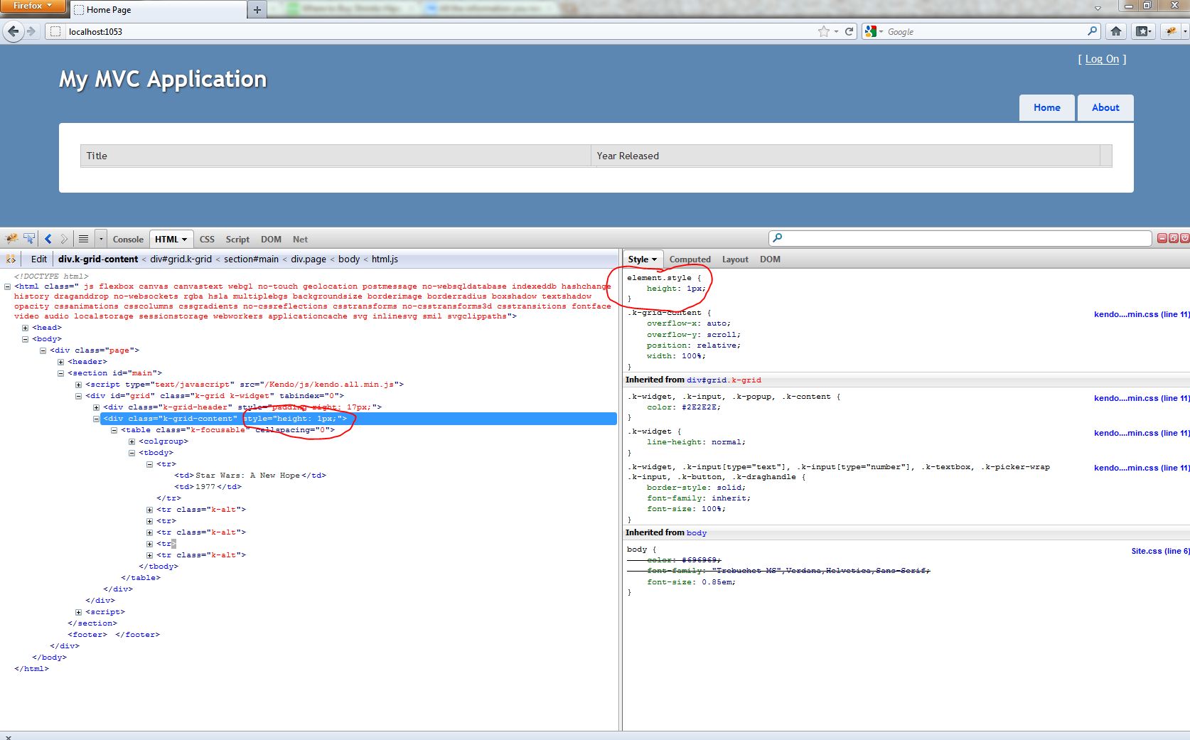 The problem goes away if i manually set the height on the grid. Still here is an example with the issue. Run the solution and it will set the height on the "k-grid-content" div to 1px.