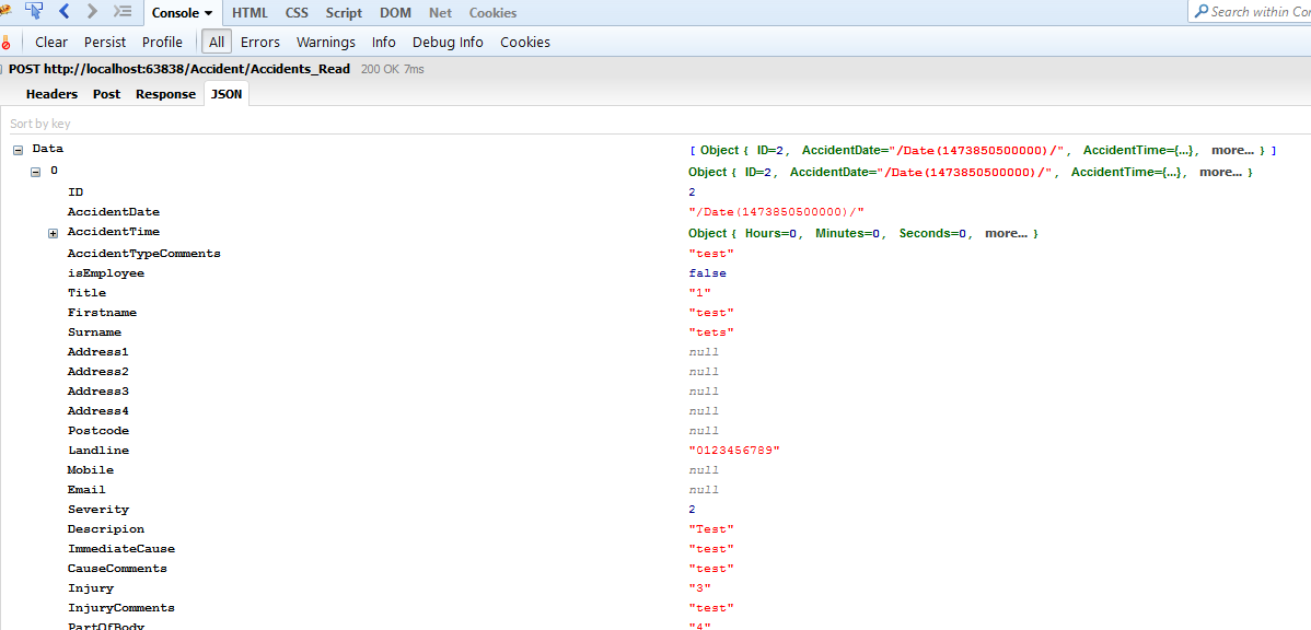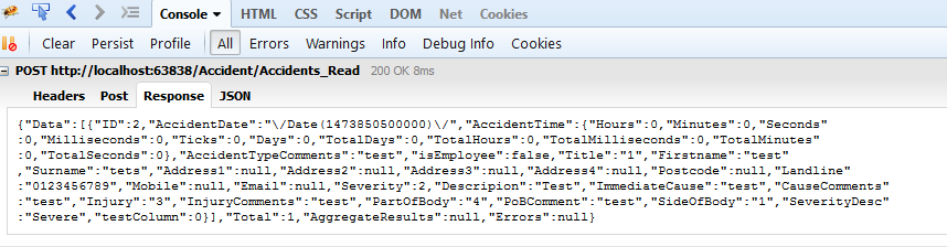 public ActionResult Accidents_Read([DataSourceRequest]DataSourceRequest request) { IQueryable<Accident> accidents = db.Accidents; DataSourceResult result = accidents.ToDataSourceResult(request, accident => new { ID = accident.ID, AccidentDate = accident.AccidentDate, Descripion = accident.Description, }); return Json(result); }The issue I am having is that the description column is that the Description column isn't being displayed, AccidentDate is displayed ok. I can see using firebug that the data is being returned ok (attached image). Does anyone have any ideas as to what might be the problem?