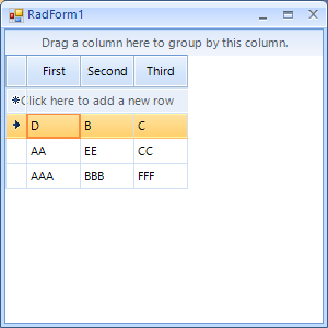 public partial class RadForm1 : RadForm{ private Timer _timer; private ObservableCollection<GridData> _data; public static bool GridBound = false; public RadForm1() { InitializeComponent(); } protected override void OnLoad( EventArgs e ) { base.OnLoad( e ); var gv = new RadGridView(); gv.Dock = DockStyle.Fill; Controls.Add( gv ); _data = new ObservableCollection<GridData>() { new GridData { First = "A", Second = "B", Third = "C" }, new GridData { First = "AA", Second = "BB", Third = "CC" }, new GridData { First = "AAA", Second = "BBB", Third = "CCC" } }; gv.DataSource = _data; GridBound = true; _timer = new Timer(); _timer.Tick += _timer_Tick; _timer.Interval = 1000; _timer.Start(); } private void _timer_Tick( object sender, EventArgs e ) { _data[0].First = "D"; _data[1].Second = "EE"; _data[2].Third = "FFF"; _timer.Stop(); } private class GridData : INotifyPropertyChanged { public event PropertyChangedEventHandler PropertyChanged; private void OnPropertyChanged( string name ) { if( PropertyChanged == null && RadForm1.GridBound ) { Debug.WriteLine( $"PropertyChanged is null, grid has not subscribed! Name = '{name}'" ); } PropertyChanged?.Invoke( this, new PropertyChangedEventArgs( name ) ); } private string _first; private string _second; private string _third; public string First { get => _first; set { _first = value; OnPropertyChanged( "First" ); } } public string Second { get => _second; set { _second = value; OnPropertyChanged( "Second" ); } } public string Third { get => _third; set { _third = value; OnPropertyChanged( "Third" ); } } }}