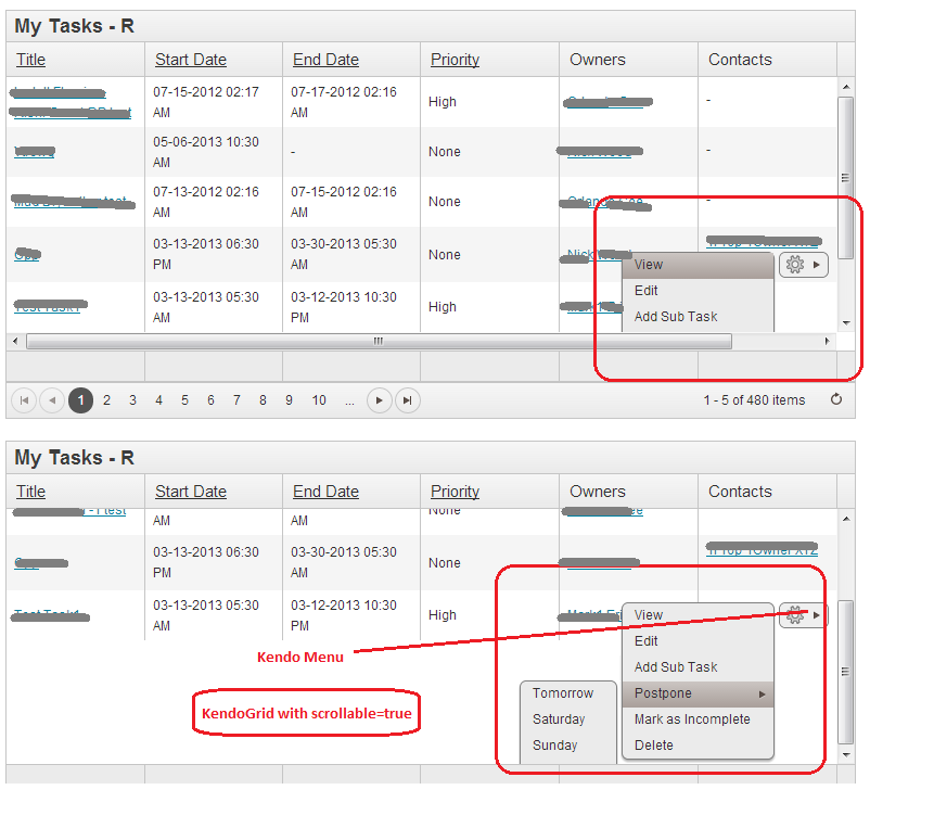 I'm using a Kendo Grid which is scrollable. So it will have div with "k-grid-content" class which supports scrolling. But I have a menu on each row and when I am adding the kendo menu, if I click on the menu, the gird's div has scrollbars because of the "k-grid-content". I would like a scrollable grid that doesn't overlap the menu.