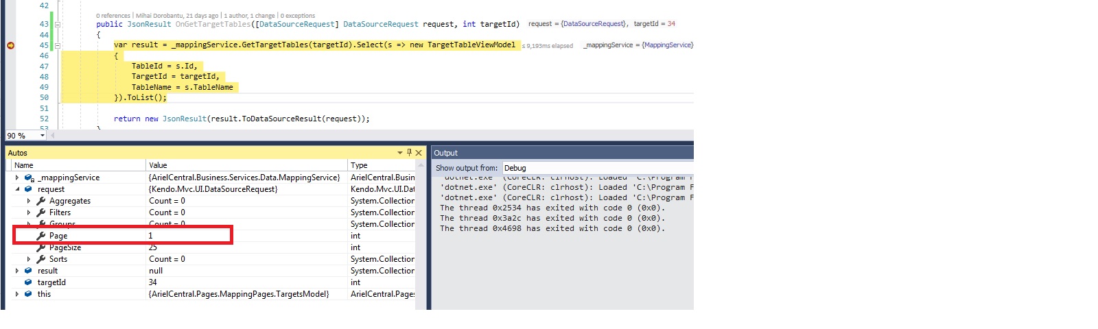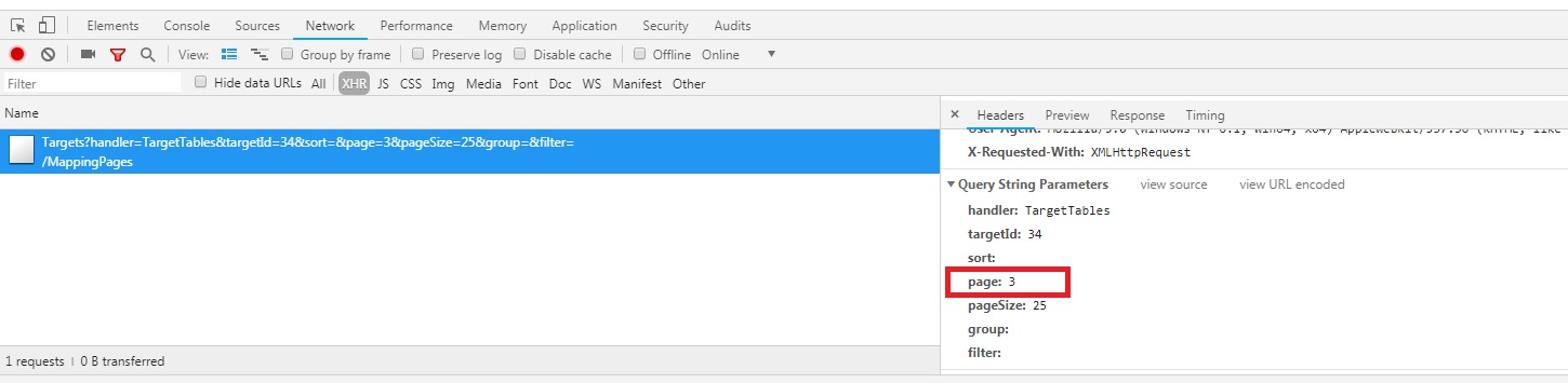 Pagination on the child grid seems not working. It always returns first page. Doing some debugging I observed that even if the page is sent correctly as a string parameter (...&page=3&...) it doesn't get into request.Page property (this is always 1). Please see my UI code below and the screenshots of the my debugging attached.