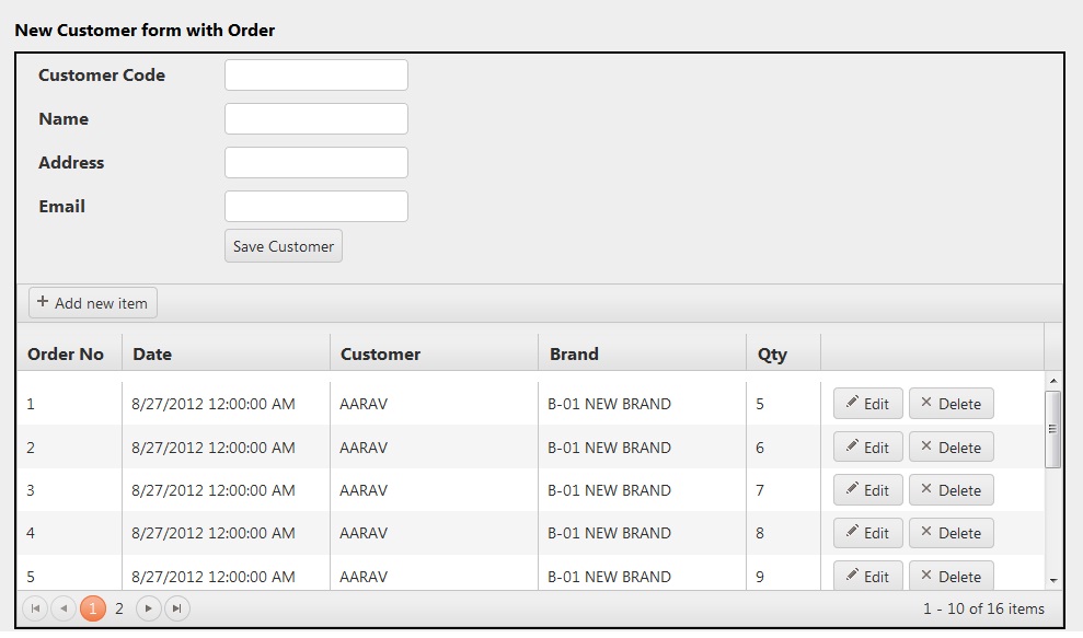 public ActionResult NewCustomer() { return View(new NewCustomer { CustomerAddress = "", CustomerEmail = "", CustomerName = "", CustomerCode = "", CustomerOrderDetails = SQLOrder.SelectAll() }); //return View(); } public ActionResult NewCustomer_Read([DataSourceRequest] DataSourceRequest request) { return Json(SessionNewCustomerRepository.All().ToDataSourceResult(request), JsonRequestBehavior.AllowGet); //return Json(SQLOrder.SelectAll().ToDataSourceResult(request), JsonRequestBehavior.AllowGet); } [AcceptVerbs(HttpVerbs.Post)] public ActionResult NewCustomer_Create([DataSourceRequest] DataSourceRequest request, CustomerOrder.Models.OrderDetails newcustomer) { if (newcustomer != null && ModelState.IsValid) { SessionNewCustomerRepository.Insert(newcustomer); } return Json(new[] { newcustomer }.ToDataSourceResult(request, ModelState)); }I have also attached the screen shot which I got.