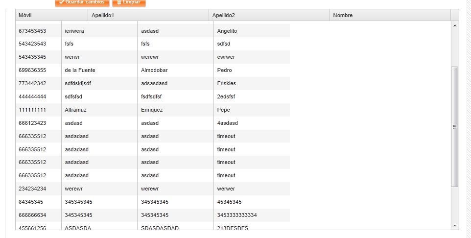 $("#list_contactos").kendoGrid({ columns: [ {title: "Móvil", field: "_movil",width: 90}, {title: "Apellido1", field: "_ape1",width: 150}, {title: "Apellido2", field: "_ape2",width: 150}, {title: "Nombre", field: "_nombre",width: 150} ], dataSource: ds, change: function(e) { //handler para manejar la seleccion de filas var fila = this.dataItem(this.select()); if(fila == null) return; $("#txtMovil").val(fila._movil); $("#txtNombre").val(fila._nombre); $("#txtApellido1").val(fila._ape1); $("#txtApellido2").val(fila._ape2); }, selectable: "row", scrollable: true, height: 450 });