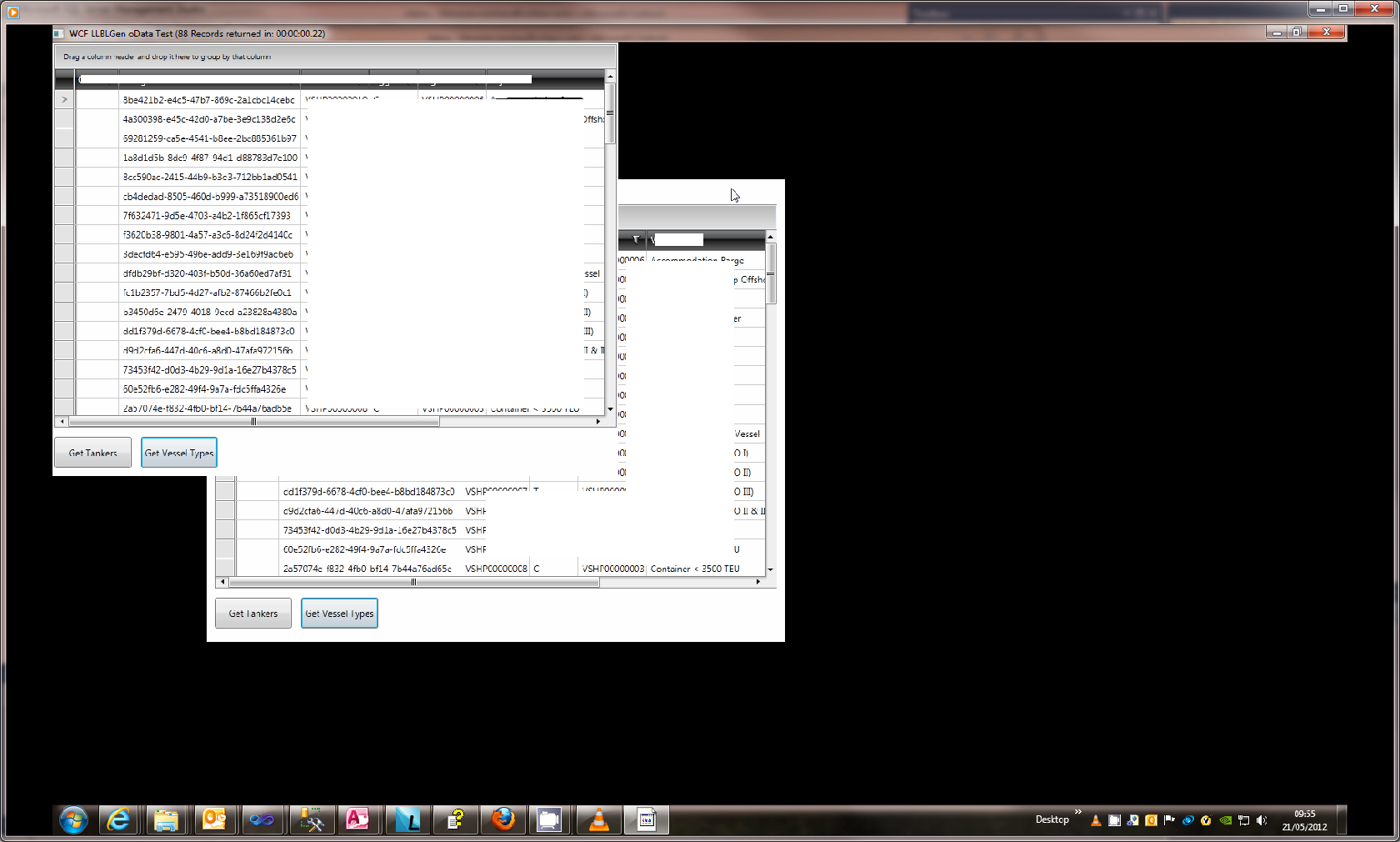 private void Window_Loaded(object sender, RoutedEventArgs e){ // Instantiate the DataServiceContext. _context = new Vessel.Service.VesselService(_svcUri);}private void button_getvesselTypes_Click(object sender, RoutedEventArgs e){ try { StartStats(); var VTQuery = from v in _context.Vestype select v; DataServiceCollection<VestypeEntity> VesselTypes = new DataServiceCollection<VestypeEntity>(VTQuery); this._radgrid_output.DataContext = VesselTypes; ShowStats(); } catch (Exception ex) { MessageBox.Show(ex.ToString()); }}<Window x:Class="TestClient.MainWindow" xmlns:telerik="http://schemas.telerik.com/2008/xaml/presentation" Title="WCF oData Test" Width="750" Height="600" x:Name="OutputWindow" Loaded="Window_Loaded"> <Grid x:Name="grid_mainlayout"> <Grid.RowDefinitions> <RowDefinition x:Name="gridrow_detailsection" Height="*"></RowDefinition> <RowDefinition x:Name="gridrow_footersection" Height="60"></RowDefinition> </Grid.RowDefinitions> <telerik:RadGridView Name="_radgrid_output" Grid.Row="0" Margin="2" HorizontalAlignment="Stretch" VerticalAlignment="Stretch" DataContext="{Binding}" ItemsSource="{Binding}" EnableColumnVirtualization="True" EnableRowVirtualization="True" DataLoadMode="Asynchronous" IsReadOnly="True" ActionOnLostFocus="None" /> <StackPanel x:Name="stackpannel_buttons" Grid.Row="1" Orientation="Horizontal"> <Button x:Name="button_Query1" Margin="2,10,10,10" Width="100" Content="Get 6000 rows" Click="button_getvessels_Click"></Button> <Button x:Name="button_Query2" Margin="2,10,10,10" Width="100" Content="Get 80 rows" Click="button_getvesselTypes_Click"></Button> </StackPanel> </Grid> </Window>