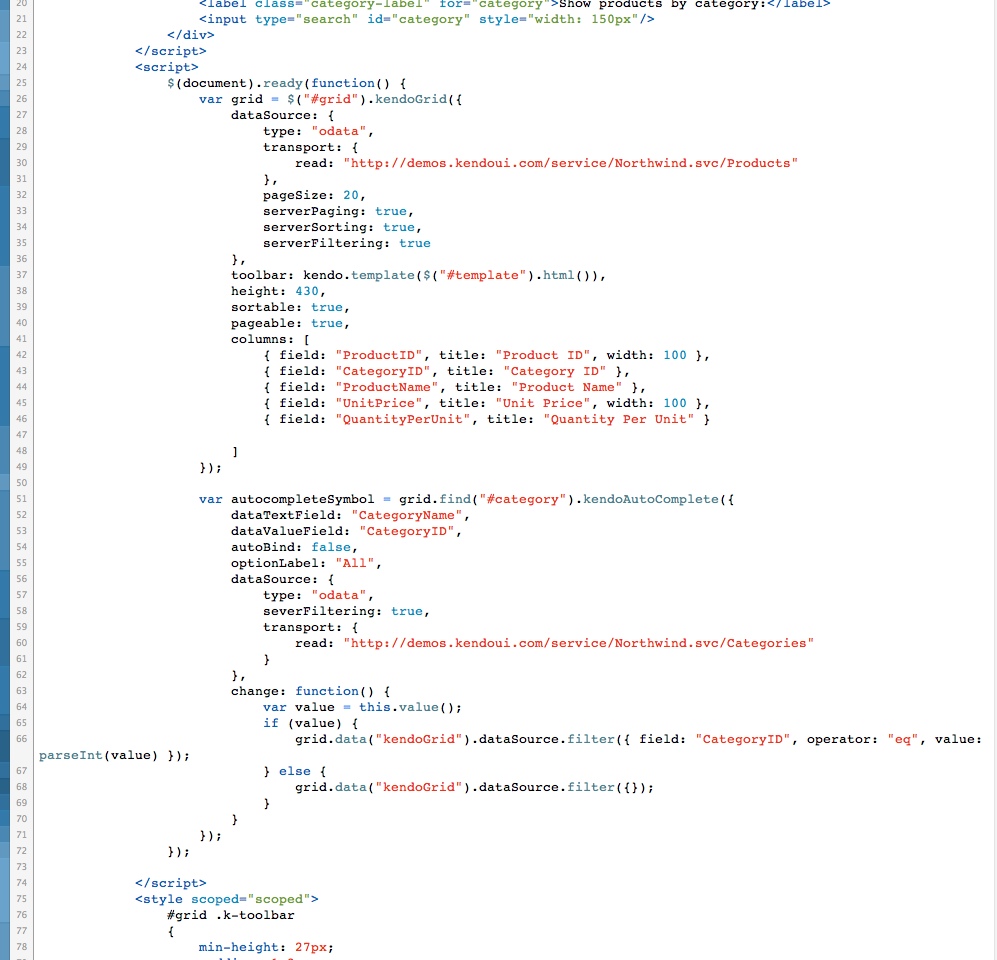 var autocompleteSymbol = $("#symbol").kendoAutoComplete({ dataTextField: "TextField", dataValueField: "ValueField", dataSource: sharedDataSource, change: function () { var value = this.value(); if (value) { grid.data("kendoGrid").dataSource.filter({ field: "ValueField", operator: "eq", value: value }); } else { grid.data("kendoGrid").dataSource.filter({}); } }});0