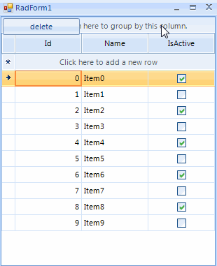 public RadForm1(){ InitializeComponent(); DataTable dt = new DataTable(); dt.Columns.Add("Id", typeof(int)); dt.Columns.Add("Name", typeof(string)); dt.Columns.Add("IsActive", typeof(bool)); for (int i = 0; i < 10; i++) { dt.Rows.Add(i, "Item" + i, i % 2 == 0); } this.radGridView1.DataSource = dt; this.radGridView1.AutoSizeColumnsMode = Telerik.WinControls.UI.GridViewAutoSizeColumnsMode.Fill;}private void radButton1_Click(object sender, EventArgs e){ this.radGridView1.BeginUpdate(); BindingList<GridViewDataRowInfo> rowsToDelete = new BindingList<GridViewDataRowInfo>(); foreach (GridViewDataRowInfo row in this.radGridView1.Rows) { if (row.Cells[2].Value.ToString() == "False") { rowsToDelete.Add(row); } } while (rowsToDelete.Count > 0) { this.radGridView1.Rows.Remove(rowsToDelete.First()); rowsToDelete.RemoveAt(0); } this.radGridView1.EndUpdate();}The attached gif file illustrates the achieved behavior.