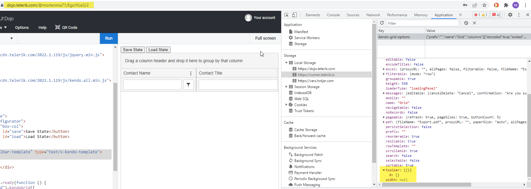 It seems that the persisting grid state with a toolbar template is not possible. The saved options has an empty toolbar (see screenshot)