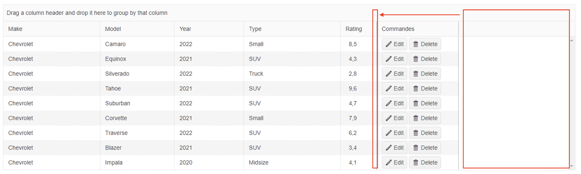 Hi, I am currently evaluating the Telerik Grid and I need to have, in my grid, a command column that stays sticked to the right of the grid no matter the width of the other elements. Note that I also allow resize of all columns (except the command column itself).