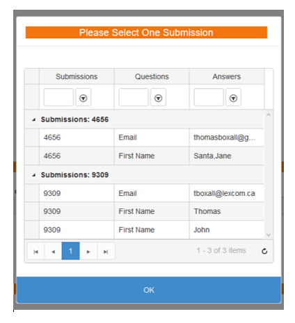 001.$.ajax({002. type: "GET",003. url: "/Actionables/SearchSubmissions/",004. data: {005. filters: param,006. moduleToSearch: moduleID,007. moduleItemToSearch: moduleItemID,008. },009. success: function (result) {010. var defer = $.Deferred();011. function confirmation(result) {012. 013. if (result.length > 1) {014. 015. $('#field' + questionID).append('<div id=dialog></div>');016. $("#dialog").append('<div id=grid></div>');017. 018. $("#dialog").kendoDialog({019. modal: true,020. visible: false,021. draggable: true,022. closable: false,023. title: "Please Select One Submission",024. maxWidth: 500,025. //maxHeight:300,026. animation: {027. open: {028. effects: "slideIn:down fadeIn",029. duration: 500030. },031. close: {032. effects: "slide:up fadeOut",033. duration: 500034. }035. },036. actions: [037. { text: 'OK', primary: true, action: onOK }038. ]039. });040. 041. $("#grid").kendoGrid({042. dataSource: {043. data: result,044. schema: {045. data: function (result) {046. return $.map(result, function (item) {047. return $.map(item, function (innerData) {048. for (var i = 0; i < displayFields.length; i++){049. if (displayFields[i] == innerData.FieldIDString)050. {051. return {052. EntryGroupID: innerData.EntryGroupID,053. FieldTextString : innerData.FieldTextString,054. EntryValue: innerData.EntryValue055. }056. }057. }059. });060. });062. }063. },064. pageSize: 2,065. group: { field: "EntryGroupID" } 066. },067. filterable: {068. mode: "row"069. },070. pageable: {071. refresh: true,072. },073. noRecords: {074. template: "No records to display"075. },076. groupable:false,077. //scrollable: true,078. selectable: true,079. columns: [{080. field: "EntryGroupID",081. title: "Submissions",082. filterable: {083. cell: {084. operator: "contains"085. }086. }087. }, {088. field: "FieldTextString",089. title: "Questions",090. filterable: {091. cell: {092. operator: "contains"093. }094. }095. }, {096. field: "EntryValue",097. title: "Answers",098. filterable: {099. cell: {100. operator: "contains"101. }102. }103. }]104. });105. 106. var wnd = $("#dialog").data("kendoDialog");107. wnd.wrapper.find('.k-dialog-title').css('background', CIMSFields.backgroundColour).css('color', CIMSFields.textColour).css('width','100%').css('text-align','center');108. wnd.open().center(true);109. 110. function onOK(e) {111. var data = [];112. var grid = $("#grid").data("kendoGrid");113. var selectedItem = grid.dataItem(grid.select());114. if (selectedItem != null) {115. $.map(result, function (item) {116. if (selectedItem.EntryGroupID == item[0].EntryGroupID) {117. data.push(item);118. defer.resolve(data);119. }120. });121. }122. else {123. defer.resolve(data);124. }125. wnd.close();126. }127. }128. else129. {130. defer.resolve(result);131. }132. return defer.promise();133. }Hello Bryan,