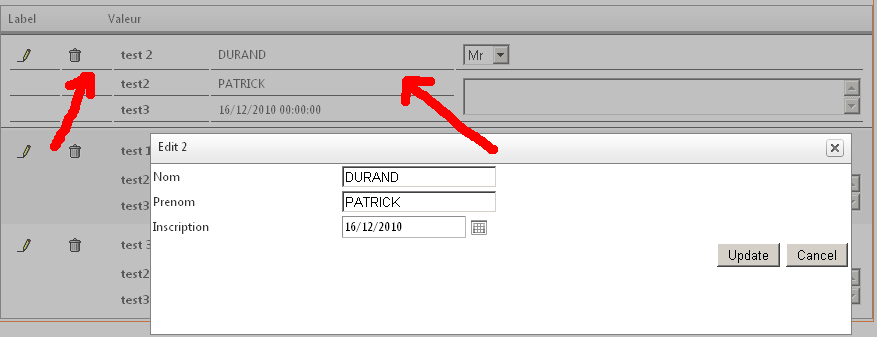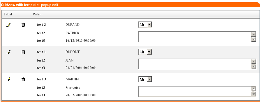 <telerik:RadGridID="RadGrid2"runat="server"AutoGenerateColumns="True"EnableViewState="True" OnNeedDataSource="RadGrid2_NeedDataSource"ShowHeader="False"Width="100%"OnDeleteCommand="test"> <MasterTableViewTableLayout="Fixed"EditMode="PopUp"> <ItemTemplate> <tablewidth="100%"> <colwidth="50px"/> <colwidth="50px"/> <colwidth="*"/> <colwidth="*"/> <colwidth="*"/> <tr> <td> <asp:ImageButtonrunat="server"ID="edit"CommandName="Edit"ImageUrl="http://localhost/imgftcarto/editicon.gif"/> </td> <td> <asp:ImageButtonrunat="server"ID="delete"CommandName="Delete"CommandArgument='<%# Eval("Identifiant")%>' ImageUrl="http://localhost/imgftcarto/delete.gif" OnClientClick="return confirm('Delete this user?');" /> </td> <td> <b>test <%# Eval("Identifiant")%></b> </td> <td> <%# Eval("Nom")%> </td> <td> <asp:DropDownListrunat="server"ID="ddl"> <asp:ListItemText="Mr"Value="Mr"></asp:ListItem> <asp:ListItemText="Mrs"Value="Mrs"></asp:ListItem> <asp:ListItemText="Ms"Value="Ms"></asp:ListItem> </asp:DropDownList> </td> </tr> <tr> <td> </td> <td> </td> <td> <b>test2</b> </td> <td> <%# Eval("Prenom")%> </td> <tdrowspan="2"> <asp:TextBoxrunat="server"ID="textplace"TextMode="MultiLine"Width="100%"></asp:TextBox> </td> </tr> <tr> <td> </td> <td> </td> <td> <b>test3</b> </td> <td> <%# Eval("Inscription") %> </td> </tr> </table> </ItemTemplate> <EditFormSettingsCaptionDataField="Identifiant"EditFormType="Template"PopUpSettings-Width="700px"PopUpSettings-Height="200px"PopUpSettings-Modal="true"> <FormTemplate> <tableid="Table1"cellspacing="1"cellpadding="1"width="100%"border="0"> <tr> <td> Nom </td> <td> <asp:TextBoxID="TextBox10"Text='<%# Bind("Nom") %>' runat="server"> </asp:TextBox> </td> </tr> <tr> <td> Prenom </td> <td> <asp:TextBoxID="TextBox1"Text='<%# Bind("Prenom") %>' runat="server"> </asp:TextBox> </td> </tr> <tr> <td> Inscription </td> <td> <telerik:RadDatePickerID="picker1"runat="server"DbSelectedDate='<%# Bind("Inscription") %>'> </telerik:RadDatePicker> </td> </tr> </table> <tablewidth="100%"> <tr> <tdalign="right"colspan="2"> <asp:ButtonID="Button1"Text='<%# (Container is GridEditFormInsertItem) ? "Insert" : "Update" %>' runat="server" CommandName='<%# (Container is GridEditFormInsertItem) ? "PerformInsert" : "Update" %>'> </asp:Button> <asp:ButtonID="Button2"Text="Cancel"runat="server"CausesValidation="False"CommandName="Cancel"> </asp:Button> </td> </tr> </table> </FormTemplate> </EditFormSettings> </MasterTableView></telerik:RadGrid><telerik:GridNumericColumnEditorID="GridNumericColumnEditor1"runat="server"NumericTextBox-Width="40px"/><telerik:GridTextBoxColumnEditorID="GridTextBoxColumnEditor1"runat="server"TextBoxStyle-Width="200px" TextBoxStyle-BackColor="#FF6600"/><telerik:GridTextBoxColumnEditorID="GridTextBoxColumnEditor2"runat="server"TextBoxStyle-Width="200px" TextBoxStyle-BackColor="#666666"/><telerik:GridDateTimeColumnEditorID="GridDateTimeColumnEditor"runat="server"/>I've added two picture to show what's wrong