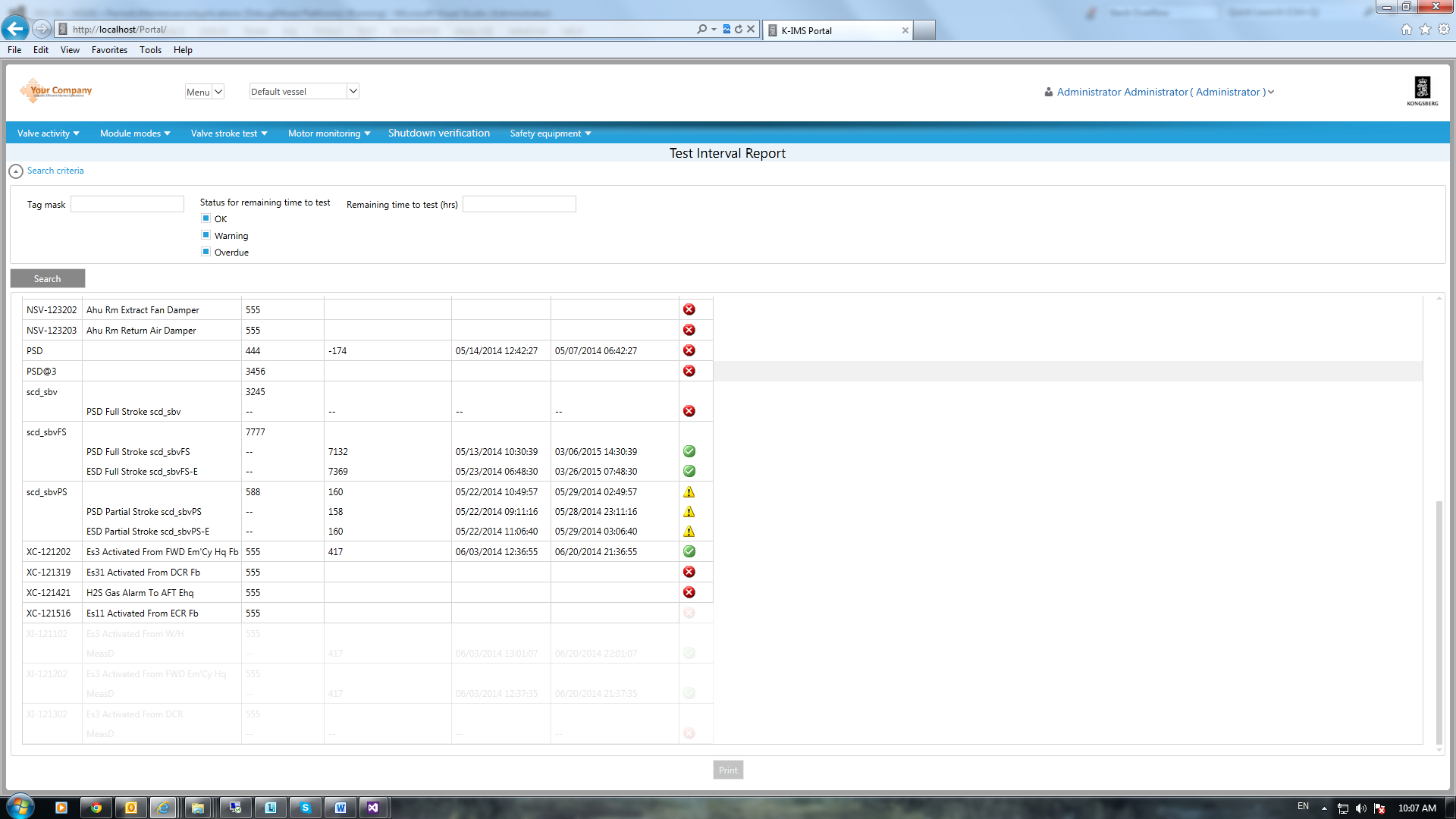 <!--Test Interval Report--> <Style TargetType="telerik:RadGridView" x:Key="NestedRadGridView"> <Setter Property="ShowColumnFooters" Value="False"/> <Setter Property="ShowGroupPanel" Value="False"/> <Setter Property="CanUserFreezeColumns" Value="False"/> <Setter Property="AutoGenerateColumns" Value="False"/> <Setter Property="ShowColumnHeaders" Value="False"/> <Setter Property="ShowInsertRow" Value="False"/> <Setter Property="RowIndicatorVisibility" Value="Collapsed"/> <Setter Property="Margin" Value="-6 -1 -3 0"></Setter> <Setter Property="Visibility" Value="{Binding ItemsSource, RelativeSource={RelativeSource Self}, Converter={StaticResource CollectionToVisibilityConverter}}"/> </Style> <DataTemplate x:Key="DetailedTestIntervalTagCellTemplate" DataType="testIntervalReport:TestIntervalViewModel"> <telerik:RadGridView ItemsSource="{Binding AllTestIntervals}" ShowColumnSortIndexes="False" Style="{StaticResource NestedRadGridView}"> <telerik:RadGridView.Columns> <telerik:GridViewDataColumn IsReadOnly="True" DataMemberBinding="{Binding Tag}"/> </telerik:RadGridView.Columns> </telerik:RadGridView> </DataTemplate> <DataTemplate x:Key="DetailedTestIntervalDescriptionCellTemplate" DataType="testIntervalReport:TestIntervalViewModel"> <telerik:RadGridView ItemsSource="{Binding AllTestIntervals}" ShowColumnSortIndexes="False" Style="{StaticResource NestedRadGridView}"> <telerik:RadGridView.Columns> <telerik:GridViewDataColumn IsReadOnly="True" DataMemberBinding="{Binding Description}"/> </telerik:RadGridView.Columns> </telerik:RadGridView> </DataTemplate> <DataTemplate x:Key="DetailedTestIntervalTestIntervalCellTemplate" DataType="testIntervalReport:TestIntervalViewModel"> <telerik:RadGridView ItemsSource="{Binding AllTestIntervals}" ShowColumnSortIndexes="False" Style="{StaticResource NestedRadGridView}"> <telerik:RadGridView.Columns> <telerik:GridViewDataColumn IsReadOnly="True" DataMemberBinding="{Binding TestIntervalValue}"/> </telerik:RadGridView.Columns> </telerik:RadGridView> </DataTemplate> <DataTemplate x:Key="DetailedTestIntervalRemainingTimeToTestCellTemplate" DataType="testIntervalReport:TestIntervalViewModel"> <telerik:RadGridView ItemsSource="{Binding AllTestIntervals}" ShowColumnSortIndexes="False" Style="{StaticResource NestedRadGridView}"> <telerik:RadGridView.Columns> <telerik:GridViewDataColumn IsReadOnly="True" DataMemberBinding="{Binding RemainingTimeToTestValue}"/> </telerik:RadGridView.Columns> </telerik:RadGridView> </DataTemplate> <DataTemplate x:Key="DetailedTestIntervalLastTestDateAndTimeCellTemplate" DataType="testIntervalReport:TestIntervalViewModel"> <telerik:RadGridView ItemsSource="{Binding AllTestIntervals}" ShowColumnSortIndexes="False" Style="{StaticResource NestedRadGridView}"> <telerik:RadGridView.Columns> <telerik:GridViewDataColumn IsReadOnly="True" DataMemberBinding="{Binding LastTestDateAndTimeValue}"/> </telerik:RadGridView.Columns> </telerik:RadGridView> </DataTemplate> <DataTemplate x:Key="DetailedTestIntervalTestExpirationDateAndTimeCellTemplate" DataType="testIntervalReport:TestIntervalViewModel"> <telerik:RadGridView ItemsSource="{Binding AllTestIntervals}" ShowColumnSortIndexes="False" Style="{StaticResource NestedRadGridView}"> <telerik:RadGridView.Columns> <telerik:GridViewDataColumn IsReadOnly="True" DataMemberBinding="{Binding TestExpirationDateAndTimeValue}"/> </telerik:RadGridView.Columns> </telerik:RadGridView> </DataTemplate> <DataTemplate x:Key="DetailedTestIntervalStatusCellTemplate" DataType="testIntervalReport:TestIntervalViewModel"> <telerik:RadGridView ItemsSource="{Binding AllTestIntervals}" ShowColumnSortIndexes="False" Style="{StaticResource NestedRadGridView}"> <telerik:RadGridView.Columns> <telerik:GridViewImageColumn IsReadOnly="True" DataMemberBinding="{Binding Status.UriSource}"/> </telerik:RadGridView.Columns> </telerik:RadGridView> </DataTemplate> <!--Test Interval Report--> <ScrollViewer HorizontalScrollBarVisibility="Auto" VerticalScrollBarVisibility="Auto" IsEnabled="{Binding AreSearchResultsValid}" Margin="6 0"> <Grid x:Name="SearchResultsGrid"> <Grid.RowDefinitions> <RowDefinition Height="Auto"/> <RowDefinition Height="Auto"/> </Grid.RowDefinitions> <telerik:RadGridView Margin="10" ItemsSource="{Binding TestIntervals}" EnableRowVirtualization="False" EnableColumnVirtualization="False" Grid.Row="0" x:Name ="TestIntervalsGridView" ShowGroupPanel="False" Visibility="{Binding HasData, Converter={StaticResource BooleanToVisibilityConverter}}"> <telerik:RadGridView.Columns> <telerik:GridViewDataColumn IsReadOnly="True" CellTemplate="{StaticResource DetailedTestIntervalTagCellTemplate}"> <telerik:GridViewDataColumn.Header> <TextBlock Text="{Binding Resources.Tag, Source={StaticResource CommonStrings}}" ToolTipService.ToolTip="{Binding Resources.TestIntervalDetailsTagTooltip, Source={StaticResource Strings}}" HorizontalAlignment="Center" /> </telerik:GridViewDataColumn.Header> </telerik:GridViewDataColumn> <telerik:GridViewDataColumn IsReadOnly="True" CellTemplate="{StaticResource DetailedTestIntervalDescriptionCellTemplate}" > <telerik:GridViewDataColumn.Header> <TextBlock Text="{Binding Resources.Description, Source={StaticResource CommonStrings}}" ToolTipService.ToolTip="{Binding Resources.TestIntervalReportDescriptionTooltip, Source={StaticResource Strings}}" HorizontalAlignment="Center"/> </telerik:GridViewDataColumn.Header> </telerik:GridViewDataColumn> <telerik:GridViewDataColumn IsReadOnly="True" CellTemplate="{StaticResource DetailedTestIntervalTestIntervalCellTemplate}" > <telerik:GridViewDataColumn.Header> <TextBlock Text="{Binding Resources.TestInterval, Source={StaticResource Strings}}" ToolTipService.ToolTip="{Binding Resources.TestIntervalTooltip, Source={StaticResource Strings}}" HorizontalAlignment="Center"/> </telerik:GridViewDataColumn.Header> </telerik:GridViewDataColumn> <telerik:GridViewDataColumn IsReadOnly="True" CellTemplate="{StaticResource DetailedTestIntervalRemainingTimeToTestCellTemplate}" > <telerik: