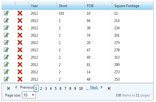 <telerik:RadGrid runat="server" ID="grdSquareFootage" SkinID="dgSOS" OnNeedDataSource="Grid_NeedDataSource" OnItemDataBound="Grid_ItemDataBound" OnItemCommand="Grid_ItemCommand" OnDataBound="Grid_DataBound"> <MasterTableView EditMode="InPlace" DataKeyNames="FiscalYear,LocationId,FamilyOfBusinessId" AllowPaging="true" AllowSorting="true" PageSize="10"> <Columns> <telerik:GridEditCommandColumn UniqueName="UpdateButton" ButtonType="ImageButton" EditImageUrl="~/Images/Edit1.gif" /> <telerik:GridButtonColumn CommandName="Delete" UniqueName="DeleteButton" ButtonType="ImageButton" ImageUrl="~/Images/Delete.gif" ConfirmText="Deleting this entry cannot be undone." Text="Delete" /> <telerik:GridNumericColumn DataField="FiscalYear" ReadOnly="true" HeaderText="Year" ItemStyle-Width="60" /> <telerik:GridNumericColumn DataField="LocationId" UniqueName="LocationId" ReadOnly="true" HeaderText="Store" ItemStyle-Width="60" /> <telerik:GridNumericColumn DataField="FamilyOfBusinessId" UniqueName="FamilyOfBusinessId" ReadOnly="true" HeaderText="FOB" ItemStyle-Width="60" /> <telerik:GridNumericColumn DataField="SquareFootage" ColumnEditorID="squareFootageEditor" HeaderText="Square Footage" ItemStyle-Width="60" /> </Columns> </MasterTableView> </telerik:RadGrid>Here is my skin: