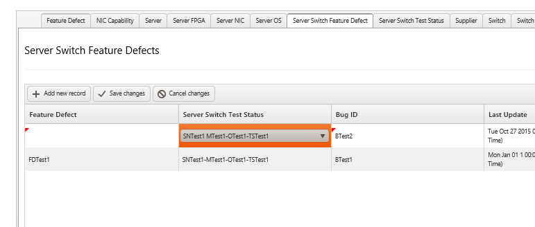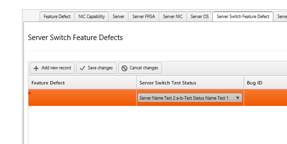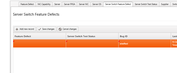 usingSystem;usingSystem.Collections.Generic;usingSystem.ComponentModel;usingSystem.Linq;usingSystem.Text;usingSystem.Threading.Tasks;namespacePhynetReporting{publicclassServerSwitchFeatureDefectModel{[DefaultValue(0)]publicintID {get;set; }[DefaultValue(0)]publicintFeatureDefectID {get;set; }[DefaultValue("")]publicstringFeatureDefectName {get;set; }[DefaultValue(0)]publicintServerSwitchTestStatusID {get;set; }[DefaultValue("")]publicstringServerSwitchTestStatusName {get;set; }[DefaultValue("")]publicstringBugID {get;set; }[DefaultValue(typeof(DateTime),"1-1-1900")]publicDateTime LastUpdate {get;set; }}}Grid View: