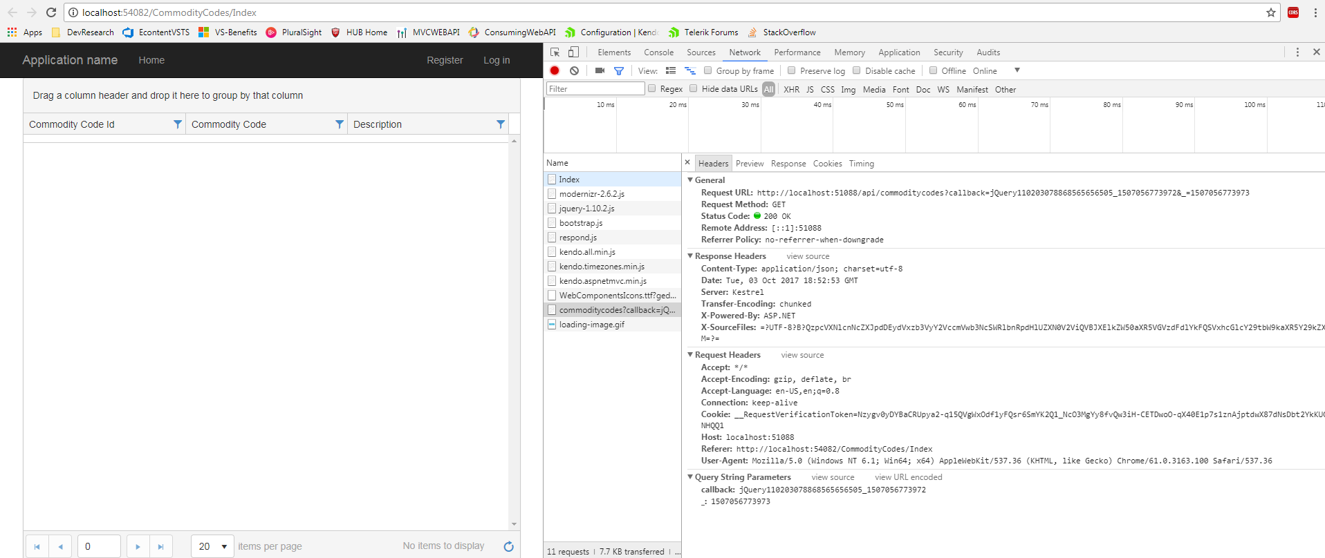 <!DOCTYPE html><html><head> <meta name="viewport" content="width=device-width" /> <title></title></head><body> <div> @(Html.Kendo().Grid<DataManager.Models.CommodityCodesViewModels.IndexViewModel>() .Name("commodityCodesGrid") .Columns(columns => { columns.Bound(c => c.CommodityCodeId).Width(100); columns.Bound(c => c.CommodityCode).Width(100); columns.Bound(c => c.Description).Width(100); }) .HtmlAttributes(new { style = "height: 700px;" }) .Scrollable(s => s.Height(700)) .Groupable() .Sortable() .Pageable(pageable => pageable .Refresh(true) .PageSizes(true) .ButtonCount(5)) .Filterable() .DataSource(dataSource => dataSource .Custom() .Batch(true) .PageSize(20) .Schema(schema => schema.Model(m => m.Id(p => p.CommodityCodeId))) .Transport(transport => { transport.Read(read => read.Url("http://localhost:51088/api/commoditycodes") .DataType("jsonp") ); }) )) </div></body></html>