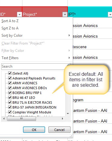 The way Excel behaves is that all checkboxes are selected in a filtered list (see attachment). Users then un-select what they don't want to see.