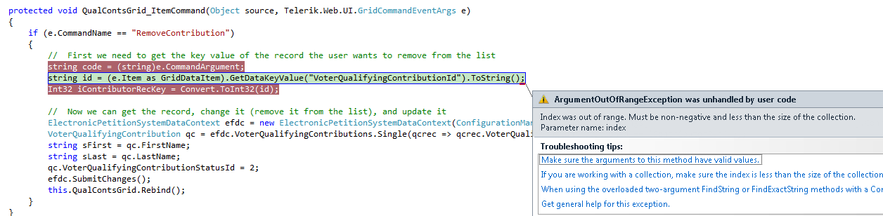 protected void QualContsGrid_ItemCommand(Object source, Telerik.Web.UI.GridCommandEventArgs e){ if (e.CommandName == "RemoveContribution") { // First we need to get the key value of the record the user wants to remove from the list string code = (string)e.CommandArgument; string id = (e.Item as GridDataItem).GetDataKeyValue("VoterQualifyingContributionId").ToString(); Int32 iContributorRecKey = Convert.ToInt32(id); // Now we can get the record, change it (remove it from the list), and update it ElectronicPetitionSystemDataContext efdc = new ElectronicPetitionSystemDataContext(ConfigurationManager.ConnectionStrings["ElectronicPetitionSystemConnectionString"].ConnectionString); VoterQualifyingContribution qc = efdc.VoterQualifyingContributions.Single(qcrec => qcrec.VoterQualifyingContributionId == iContributorRecKey); string sFirst = qc.FirstName; string sLast = qc.LastName; qc.VoterQualifyingContributionStatusId = 2; efdc.SubmitChanges(); this.QualContsGrid.Rebind(); }}The grid definition code is: