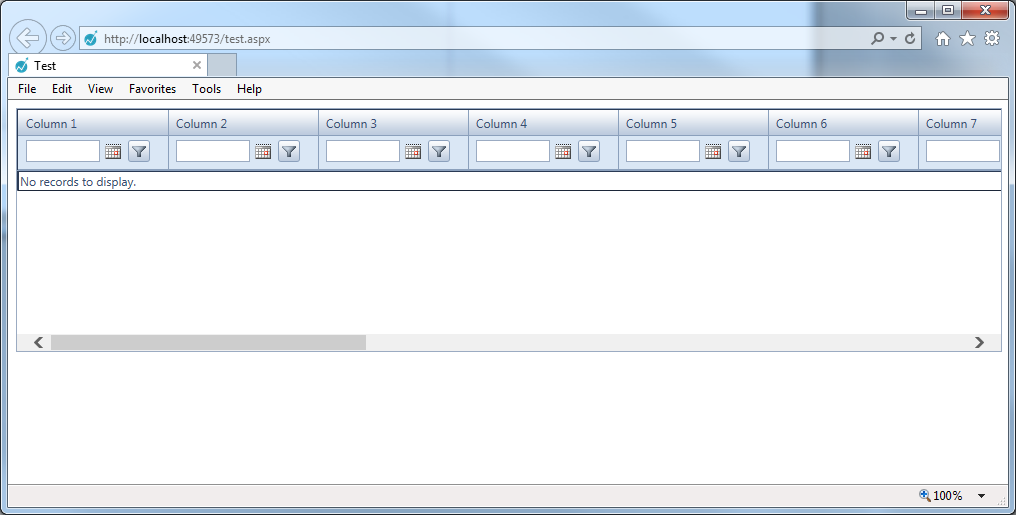 <%@ Page Language="C#" AutoEventWireup="true" CodeBehind="Test.aspx.cs" Inherits="Test.Test" %><!DOCTYPE html><html xmlns="http://www.w3.org/1999/xhtml"><head runat="server"> <title>Test</title></head><body> <form id="form1" runat="server"> <telerik:RadScriptManager ID="RadScriptManager1" runat="server" /> <telerik:RadSkinManager ID="RadSkinManager1" runat="server" PersistenceMode="Cookie" ShowChooser="false" EnableViewState="false" /> <telerik:RadGrid ID="RadGrid1" runat="server" Width="100%" AutoGenerateColumns="False" CellSpacing="0" GridLines="Vertical" EnableLinqExpressions="false" AllowFilteringByColumn="true" OnNeedDataSource="RadGrid1_NeedDataSource"> <MasterTableView Width="100%" AllowSorting="true"> <Columns> <telerik:GridDateTimeColumn HeaderText="Column 1" UniqueName="C1" DataField="C1" HeaderStyle-Width="150px" FilterControlWidth="100px" /> <telerik:GridDateTimeColumn HeaderText="Column 2" UniqueName="C2" DataField="C1" HeaderStyle-Width="150px" FilterControlWidth="100px" /> <telerik:GridDateTimeColumn HeaderText="Column 3" UniqueName="C3" DataField="C1" HeaderStyle-Width="150px" FilterControlWidth="100px" /> <telerik:GridDateTimeColumn HeaderText="Column 4" UniqueName="C4" DataField="C1" HeaderStyle-Width="150px" FilterControlWidth="100px" /> <telerik:GridDateTimeColumn HeaderText="Column 5" UniqueName="C5" DataField="C1" HeaderStyle-Width="150px" FilterControlWidth="100px" /> <telerik:GridDateTimeColumn HeaderText="Column 6" UniqueName="C6" DataField="C1" HeaderStyle-Width="150px" FilterControlWidth="100px" /> <telerik:GridDateTimeColumn HeaderText="Column 7" UniqueName="C7" DataField="C1" HeaderStyle-Width="150px" FilterControlWidth="100px" /> <telerik:GridDateTimeColumn HeaderText="Column 8" UniqueName="C8" DataField="C1" HeaderStyle-Width="150px" FilterControlWidth="100px" /> <telerik:GridDateTimeColumn HeaderText="Column 9" UniqueName="C9" DataField="C1" HeaderStyle-Width="150px" FilterControlWidth="100px" /> <telerik:GridDateTimeColumn HeaderText="Column 10" UniqueName="C10" DataField="C1" HeaderStyle-Width="150px" FilterControlWidth="100px" /> <telerik:GridDateTimeColumn HeaderText="Column 11" UniqueName="C11" DataField="C1" HeaderStyle-Width="150px" FilterControlWidth="100px" /> <telerik:GridDateTimeColumn HeaderText="Column 12" UniqueName="C12" DataField="C1" HeaderStyle-Width="150px" FilterControlWidth="100px" /> <telerik:GridDateTimeColumn HeaderText="Column 13" UniqueName="C13" DataField="C1" HeaderStyle-Width="150px" FilterControlWidth="100px" /> <telerik:GridDateTimeColumn HeaderText="Column 14" UniqueName="C14" DataField="C1" HeaderStyle-Width="150px" FilterControlWidth="100px" /> <telerik:GridDateTimeColumn HeaderText="Column 15" UniqueName="C15" DataField="C1" HeaderStyle-Width="150px" FilterControlWidth="100px" /> <telerik:GridDateTimeColumn HeaderText="Column 16" UniqueName="C16" DataField="C1" HeaderStyle-Width="150px" FilterControlWidth="100px" /> <telerik:GridDateTimeColumn HeaderText="Column 17" UniqueName="C17" DataField="C1" HeaderStyle-Width="150px" FilterControlWidth="100px" /> <telerik:GridDateTimeColumn HeaderText="Column 18" UniqueName="C18" DataField="C1" HeaderStyle-Width="150px" FilterControlWidth="100px" /> <telerik:GridDateTimeColumn HeaderText="Column 19" UniqueName="C19" DataField="C1" HeaderStyle-Width="150px" FilterControlWidth="100px" /> </Columns> </MasterTableView> <ClientSettings> <Selecting AllowRowSelect="true" /> <Scrolling AllowScroll="True" UseStaticHeaders="True" ScrollHeight="180" /> <Resizing AllowResizeToFit="true" AllowColumnResize="true" /> </ClientSettings> </telerik:RadGrid> </form></body></html>