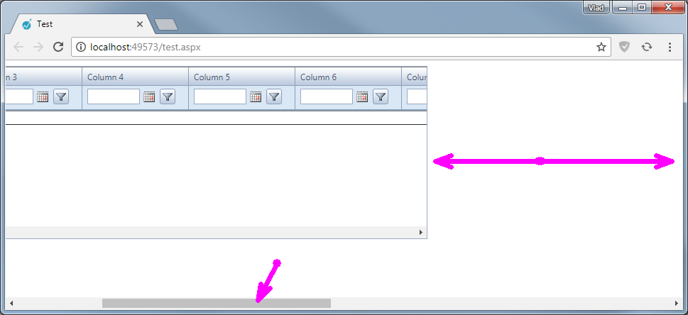 When I have many columns of type GridDateTimeColumn in a grid with AllowFilteringByColumn="true", the Chrome shows the horizontal scroll bar for the whole browser window in addition to the grid’s scroll bar (please see the code and the attached screenshot below).