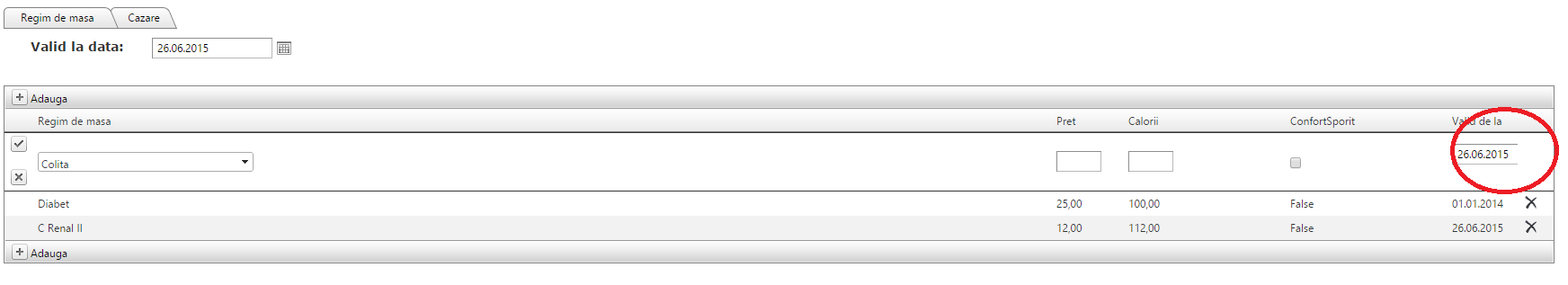 <telerik:RadGrid ID="rgMealPlanPrices" runat="server" AutoGenerateColumns="false" AllowFilteringByColumn="False" AllowSorting="True" AllowPaging="True" PageSize="30" OnNeedDataSource="rgMealPlanPrices_NeedDataSource" OnDeleteCommand="rgMealPlanPrices_DeleteCommand" OnItemDataBound="rgMealPlanPrices_ItemDataBound" OnInsertCommand="rgMealPlanPrices_InsertCommand" OnItemCommand="rgMealPlanPrices_ItemCommand" OnItemCreated="rgMealPlanPrices_ItemCreated"> <MasterTableView DataKeyNames="Id" CommandItemDisplay="TopAndBottom" ShowHeadersWhenNoRecords="True" TableLayout="Fixed" EditMode="InPlace" meta:resourcekey="rgMealPlanPricesResource"> <CommandItemSettings AddNewRecordText="Adauga" ShowRefreshButton="False" ExportToPdfText="Export to PDF" /> <RowIndicatorColumn Visible="False"> <HeaderStyle Width="20px"></HeaderStyle> </RowIndicatorColumn> <ExpandCollapseColumn Visible="False"> <HeaderStyle Width="19px"></HeaderStyle> </ExpandCollapseColumn> <Columns> <telerik:GridEditCommandColumn ButtonType="ImageButton" UniqueName="EditCommandColumn" HeaderStyle-Width="30px"> </telerik:GridEditCommandColumn> <telerik:GridBoundColumn DataField="Id" HeaderText="Id" ReadOnly="true" UniqueName="Id" ForceExtractValue="Always" ConvertEmptyStringToNull="true" Display="False" /> <telerik:GridBoundColumn DataField="Code" HeaderText="Cod" meta:resourcekey="MealPlanCodeResource" Display="False" UniqueName="MealPlanCode"> </telerik:GridBoundColumn> <telerik:GridTemplateColumn DataField="MealPlan" HeaderText="Regim de masa" UniqueName="MealPlanName" meta:resourcekey="MealPlanResource"> <EditItemTemplate> <telerik:RadComboBox ID="rcbMealPlan" runat="server" AppendDataBoundItems="True" DataTextField="DisplayName" DataValueField="Id" Filter="Contains" MarkFirstMatch="true" DropDownWidth="240" EmptyMessage="Search by name" meta:resourcekey="rcbMealPlanResource" Width="240"> </telerik:RadComboBox> <asp:RequiredFieldValidator ID="rfvMealPlan" runat="server" ControlToValidate="rcbMealPlan" EnableClientScript="true" SetFocusOnError="true" meta:resourcekey="rfvMealPlanResource"> </asp:RequiredFieldValidator> </EditItemTemplate> <ItemTemplate> <%# Eval("DisplayName") %> </ItemTemplate> </telerik:GridTemplateColumn> <telerik:GridTemplateColumn DataField="MealPlanPrice" HeaderText="Pret" UniqueName="MealPlanName" meta:resourcekey="MealPlanPriceResource"> <EditItemTemplate> <telerik:RadNumericTextBox ID="txtPrice" runat="server" DataType="System.Decimal" Width="50px"> <NumberFormat DecimalDigits="2" DecimalSeparator="." GroupSeparator="" KeepNotRoundedValue="true" AllowRounding="false" /> </telerik:RadNumericTextBox> <asp:RequiredFieldValidator ID="rfvPrice" runat="server" ControlToValidate="txtPrice" EnableClientScript="true" SetFocusOnError="true" meta:resourcekey="rfvMealPlanResource" /> </EditItemTemplate> <ItemTemplate> <%# Eval("Price") %> </ItemTemplate> <HeaderStyle Width="80px" /> </telerik:GridTemplateColumn> <telerik:GridTemplateColumn DataField="MealPlanCalories" HeaderText="Calorii" UniqueName="MealPlanCalories" meta:resourcekey="MealPlanCaloriesResource"> <EditItemTemplate> <telerik:RadNumericTextBox ID="txtCalories" runat="server" DataType="System.Decimal" Width="50px"> <NumberFormat DecimalDigits="0" DecimalSeparator="." GroupSeparator="" KeepNotRoundedValue="true" AllowRounding="false" /> </telerik:RadNumericTextBox> <asp:RequiredFieldValidator ID="rfvCalories" runat="server" ControlToValidate="txtCalories" EnableClientScript="true" SetFocusOnError="true" meta:resourcekey="rfvMealPlanResource" /> </EditItemTemplate> <ItemTemplate> <%# Eval("Calories") %> </ItemTemplate> <HeaderStyle Width="180px" /> </telerik:GridTemplateColumn> <telerik:GridTemplateColumn DataField="MealPlanConfortSporit" HeaderText="ConfortSporit" UniqueName="MealPlanConfortSporit"> <EditItemTemplate> <asp:CheckBox ID="ckbConfortSporit" runat="server" ></asp:CheckBox> </EditItemTemplate> <ItemTemplate> <%# Eval("ConfortSporit") %> </ItemTemplate> <HeaderStyle Width="180px" /> </telerik:GridTemplateColumn> <telerik:GridDateTimeColumn DataField="IssueDate" HeaderText="Valid de la" HeaderStyle-Wrap="true" DataFormatString="{0:dd.MM.yyyy}" meta:resourcekey="ValidFromResource" PickerType="DatePicker" Resizable="true"> <HeaderStyle Width="80px" /> </telerik:GridDateTimeColumn> <telerik:GridButtonColumn ConfirmText="Delete this meal plan?" ConfirmDialogType="RadWindow" ConfirmDialogHeight="110px" ConfirmTitle="Delete" ButtonType="ImageButton" Text="Delete" CommandName="Delete" meta:resourcekey="DeleteCommandResource" ImageUrl="~\Image\icon\16x16_Microsoft_Style\delete_16_OLD.gif" UniqueName="DeleteServiceColumn"> <HeaderStyle Width="40px" /> </telerik:GridButtonColumn> </Columns> </MasterTableView> </telerik:RadGrid>