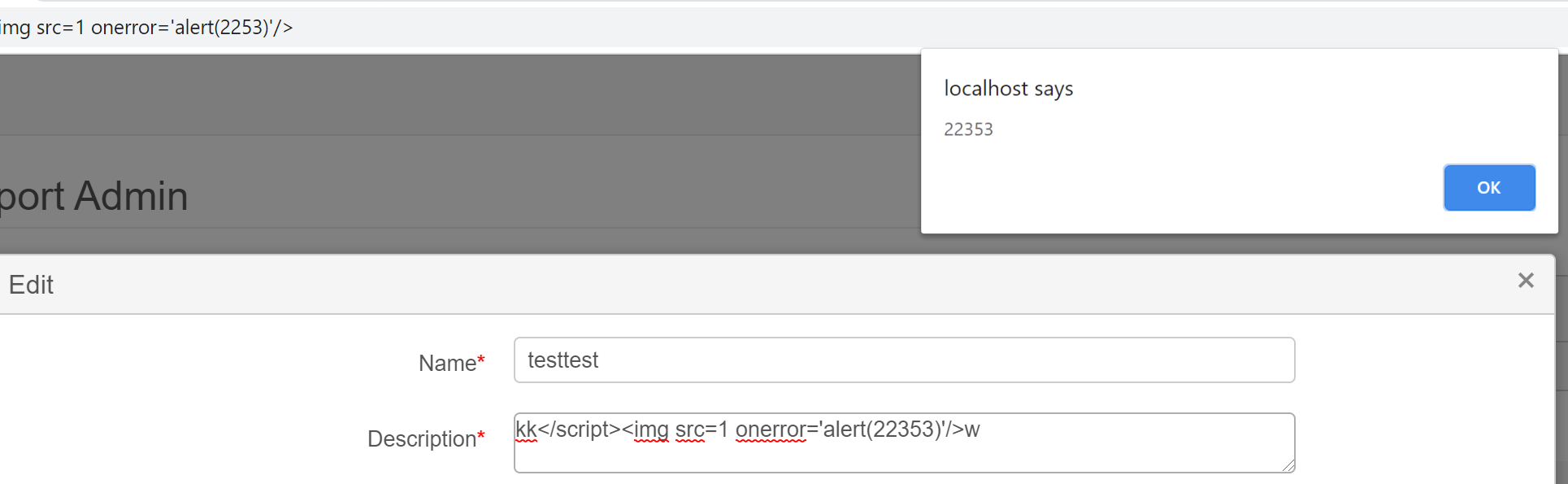 Hi Viktor.I have looked into the a bit more and can describe a bot more what is happening.When you click outside a textbox the src in kk</script><img src=1 onerror='alert(223)'/> tries to make a call to our backend.Obviously there is no endpoint matching one so a 404 is returned and the onerror part is executed